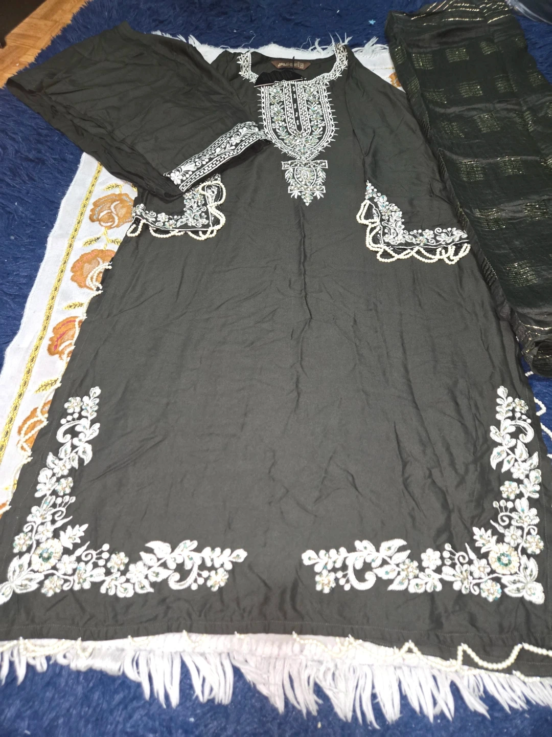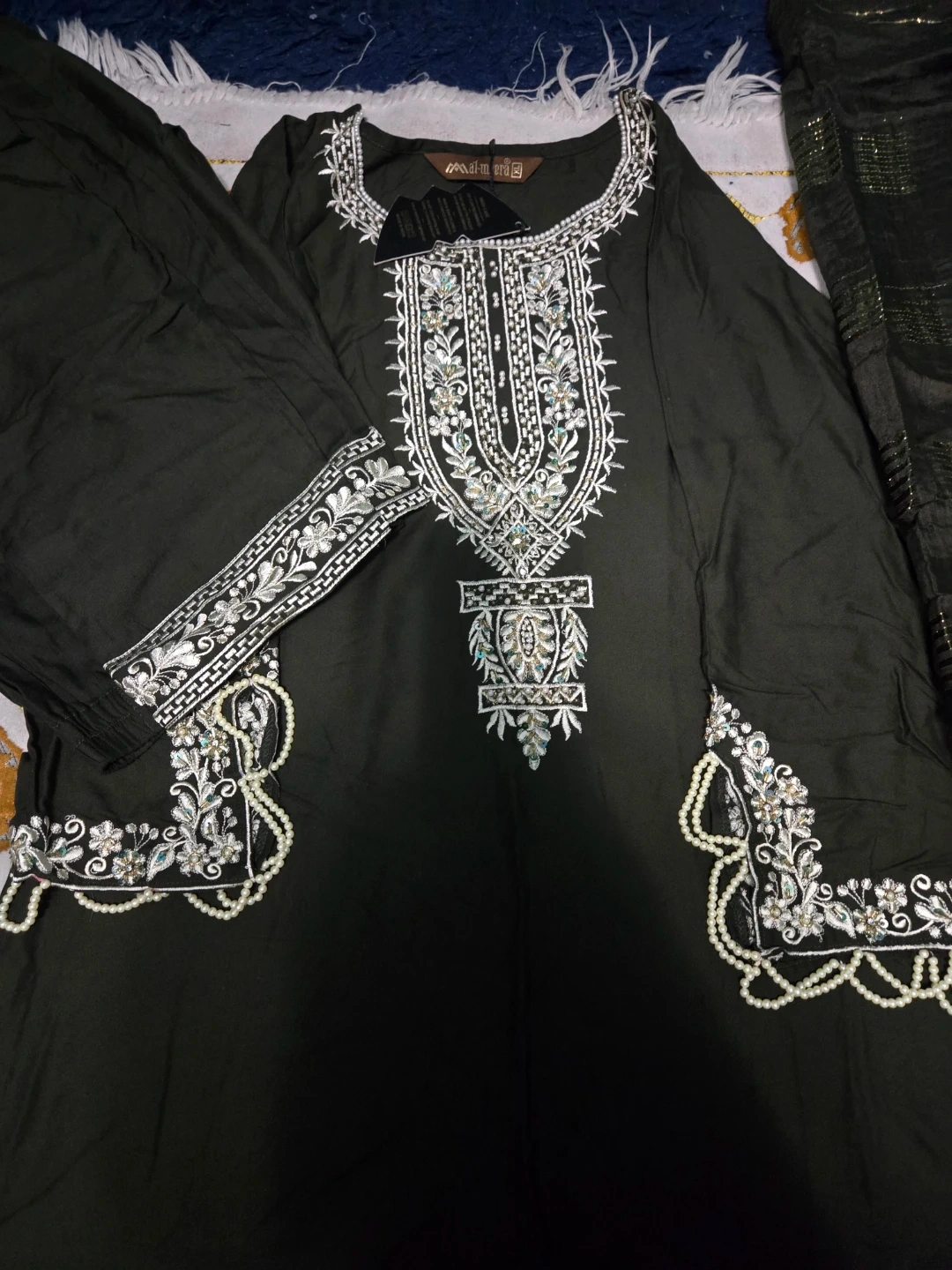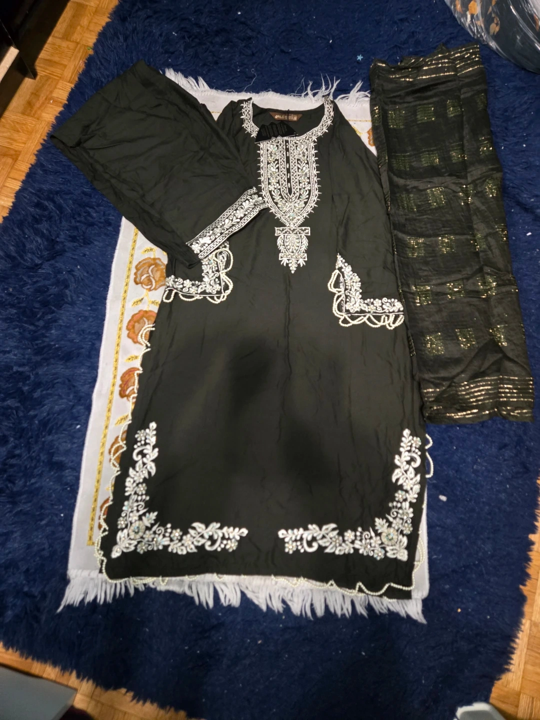 This is a olive green kurti set featuring intricate white embroidery with pearl and bead accents. It includes a matching dupatta and pants. The kurti is a size medium.