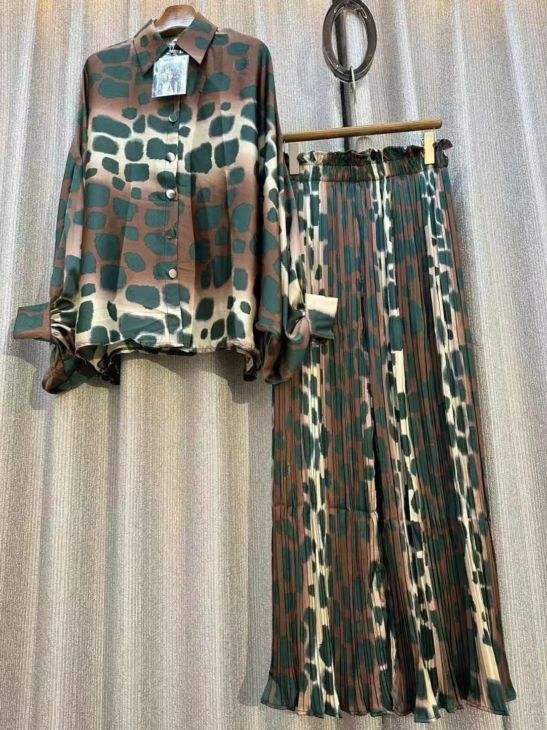 18Selling a cute matching plazo and shirt set! The set features a unique animal print design in shades of green, brown, and cream. The pants is a pleated style, and the shirt has a button-down front. Perfect for adding a stylish touch to your wardrobe!