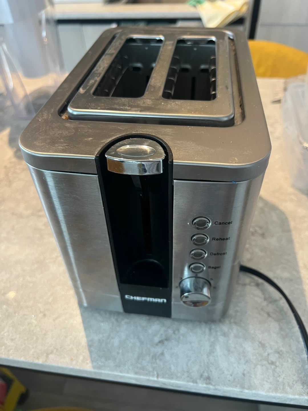 Selling a Chefman 2-slice toaster. It has settings for cancel, reheat, defrost, and bagel. It is in used condition.