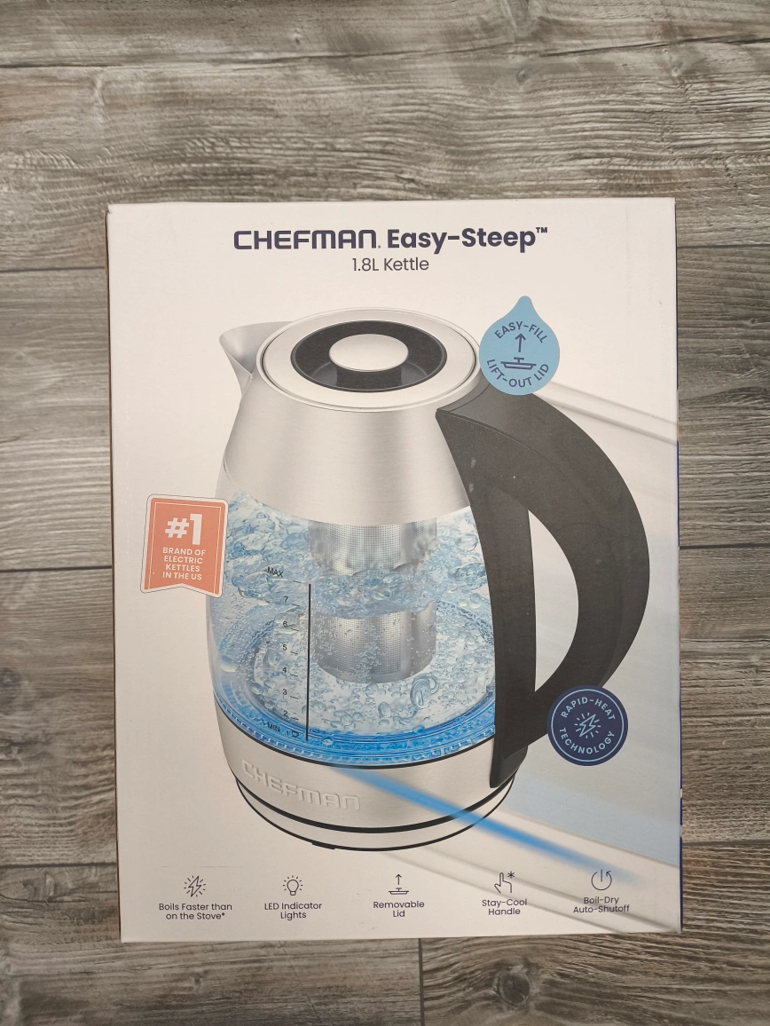 15Selling a Chefman Easy-Steep 1.8L Kettle, it's practically brand new! This kettle boils water faster than on the stove and features LED indicator lights. It also has a removable lid and a stay-cool handle, plus automatic shut-off for safety. It's a great addition to any kitchen!