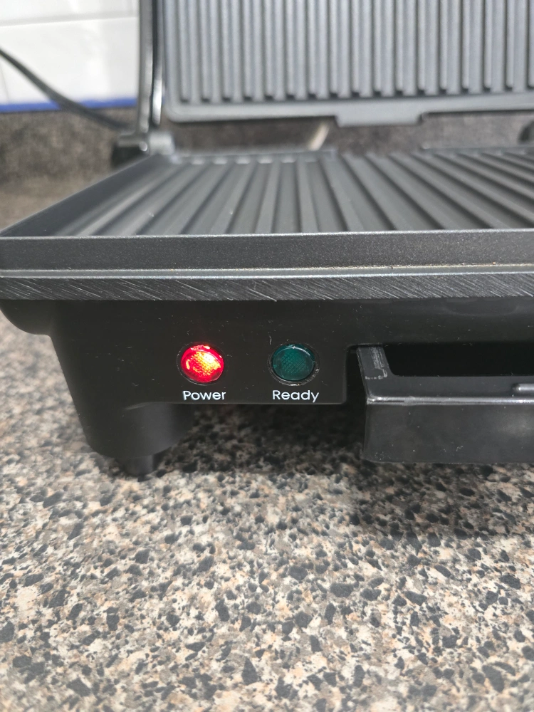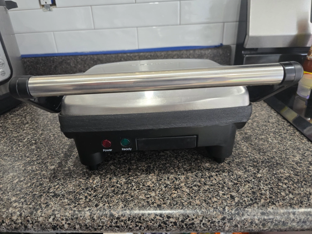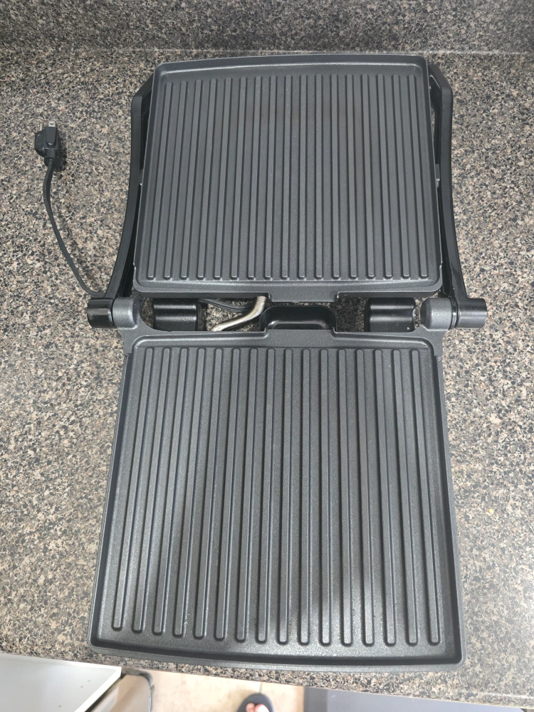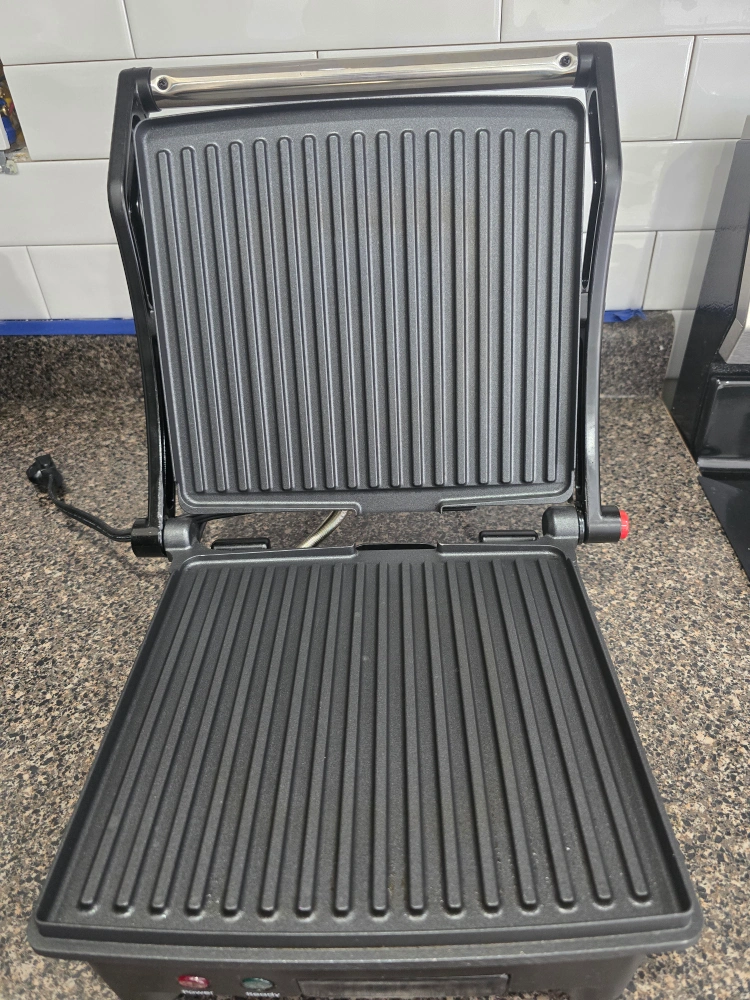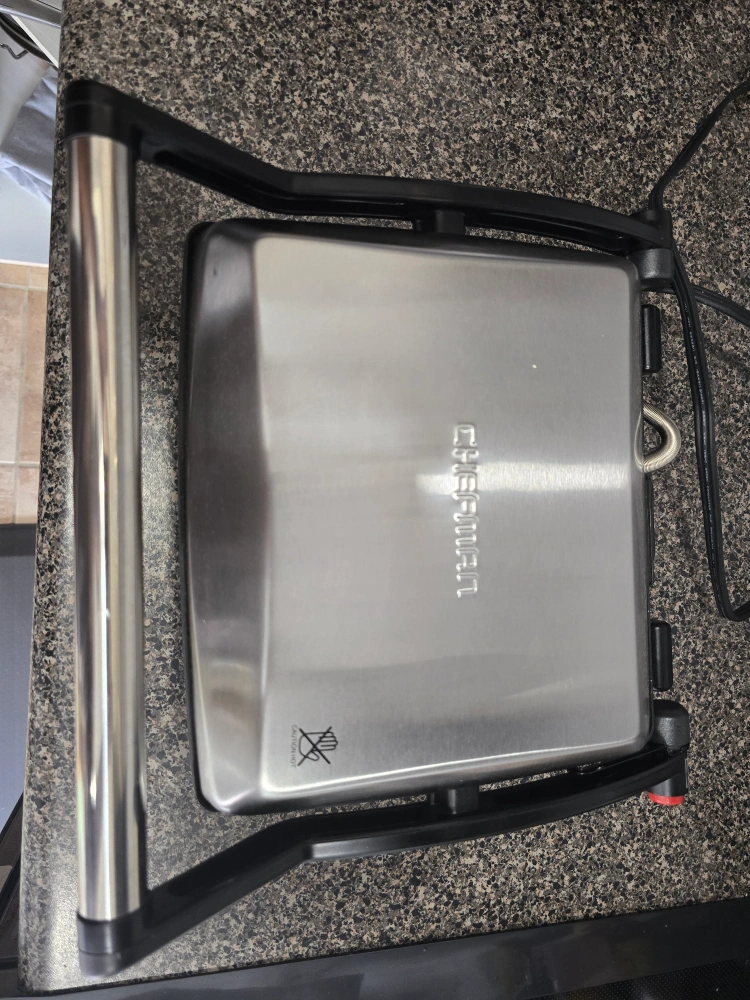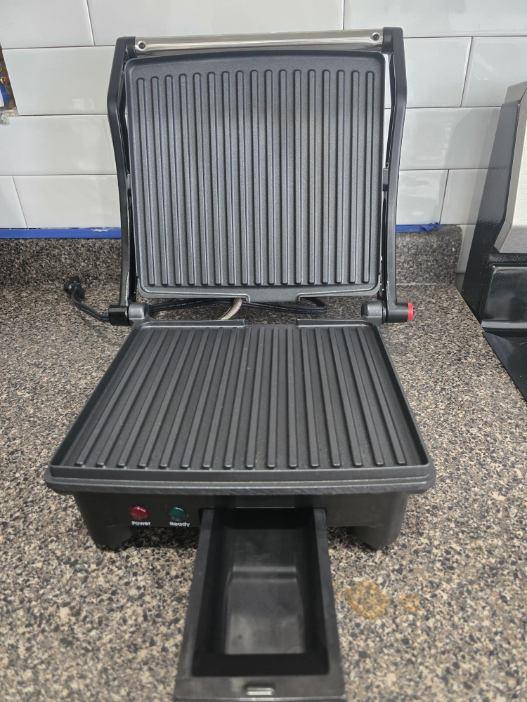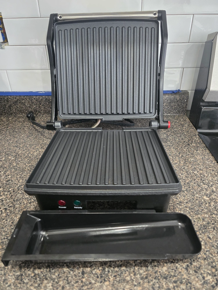 Selling a Chefman panini grill (only used 3 times) in great condition! It's perfect for making quick and delicious sandwiches or grilling other foods. It also comes with a drip tray to catch any excess grease or oil. It has 180° floating hinges to accommodate different size sandwiches
