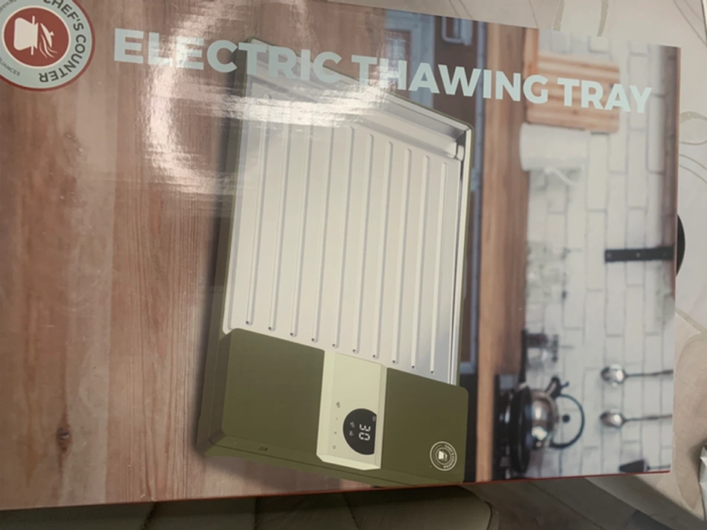 71I'm selling a Chef's Counter Electric Thawing Tray! It quickly and efficiently defrosts foods with 360° airflow for uniform thawing. The ionic field technology helps preserve freshness, and the tray grooves catch drips. Dimensions are 14.76" x 9.45" x 1.81"