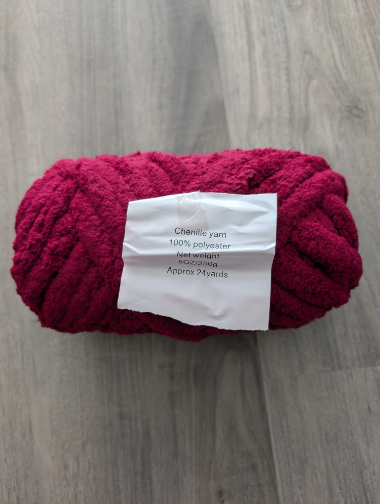 0I'm selling a skein of chenille yarn in a lovely burgundy colour! It's 100% polyester and weighs 8oz/250g, with approximately 24 yards. Perfect for your next cozy project! I have more of these please ask!