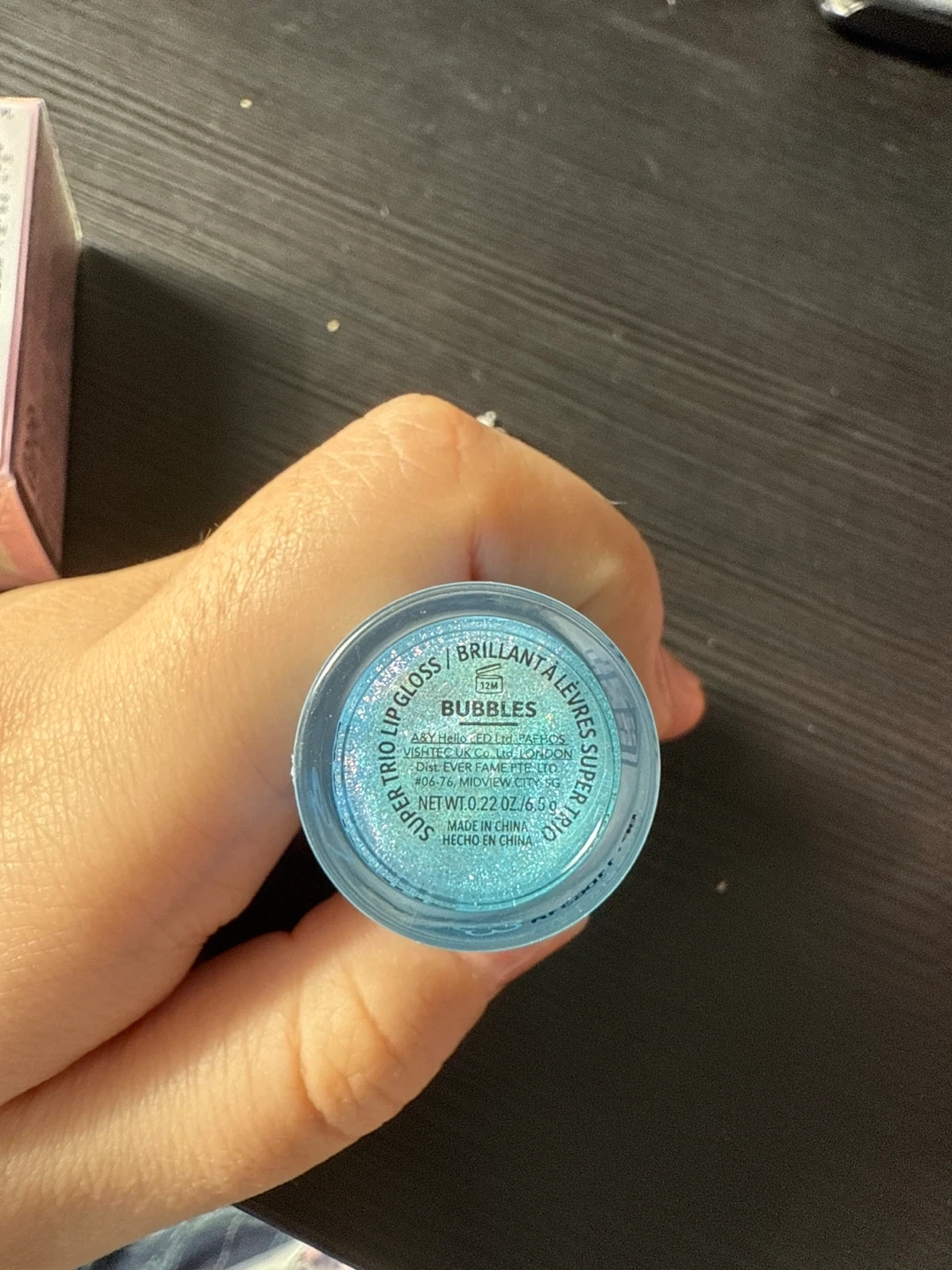 This is the "Bubbles" lip gloss from SHEGLAM's Super Trio line. It comes in a sparkling blue shade and includes a cute Powerpuff Girls charm. Net weight is 0.22 oz (6.6g).