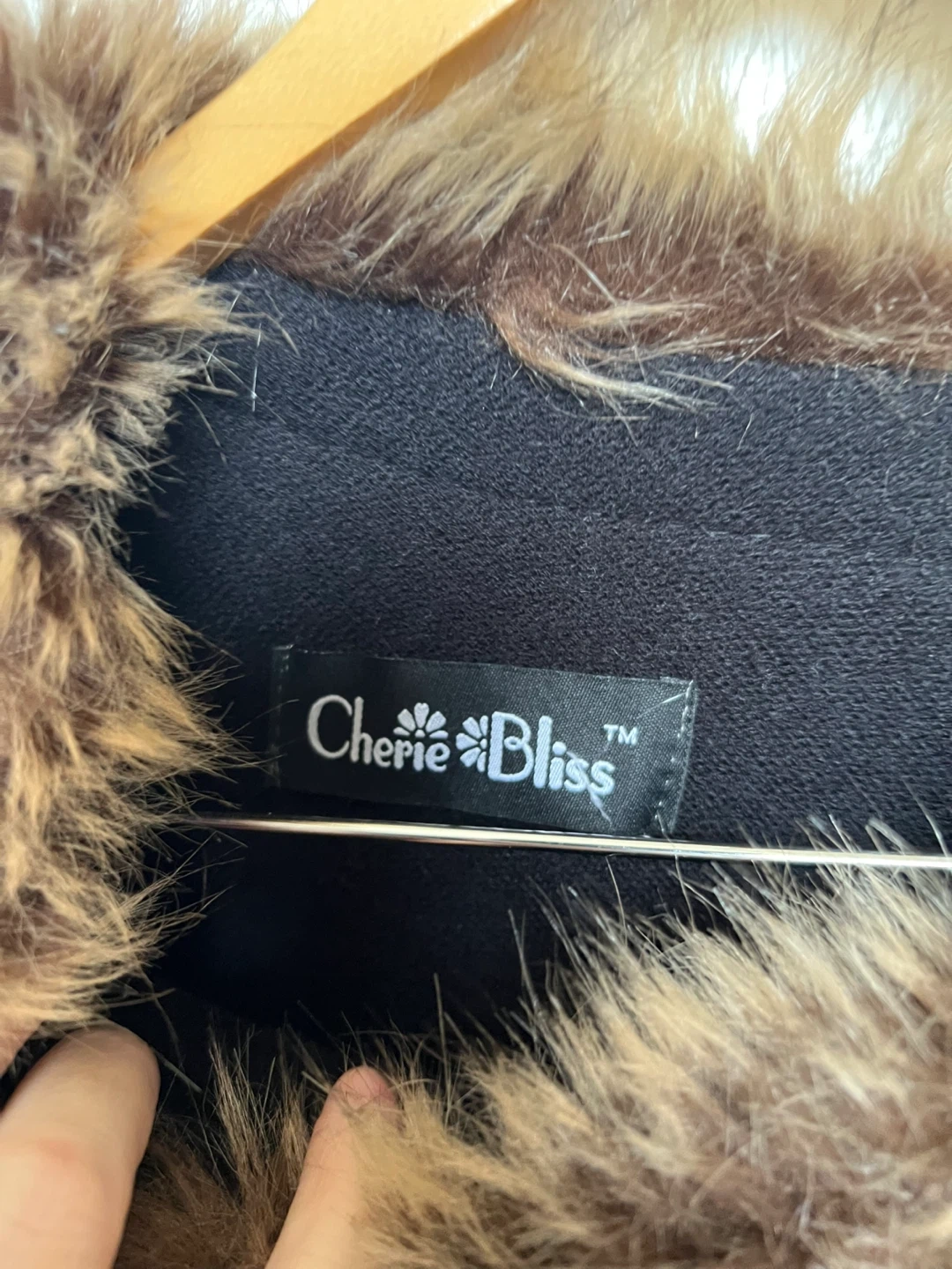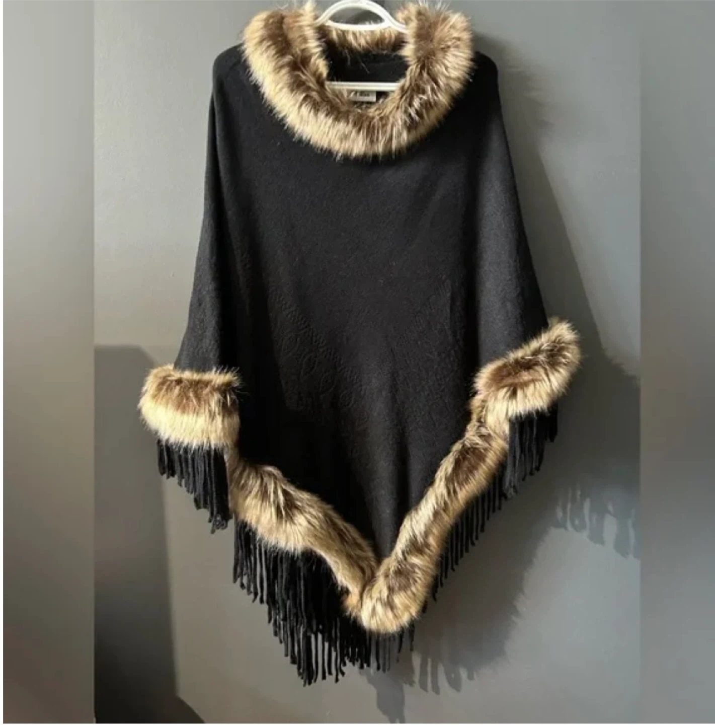 86Selling a stylish black poncho from Cherie Bliss. It features a lovely faux fur trim, adding a touch of elegance to any outfit. Perfect for layering during cooler weather!