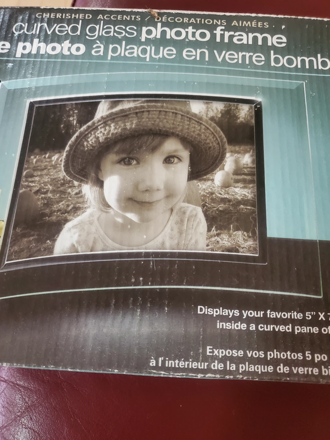 10Selling a Cherished Accents curved glass photo frame! It displays your favourite 5" x 7" photographs inside a curved pane of beveled glass. Box included