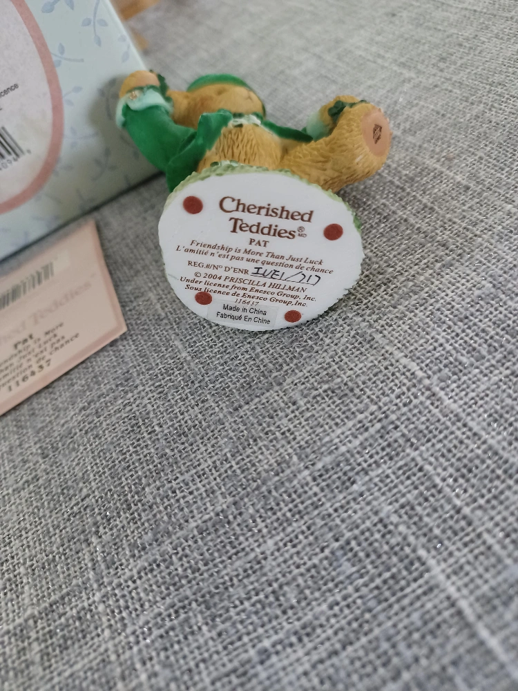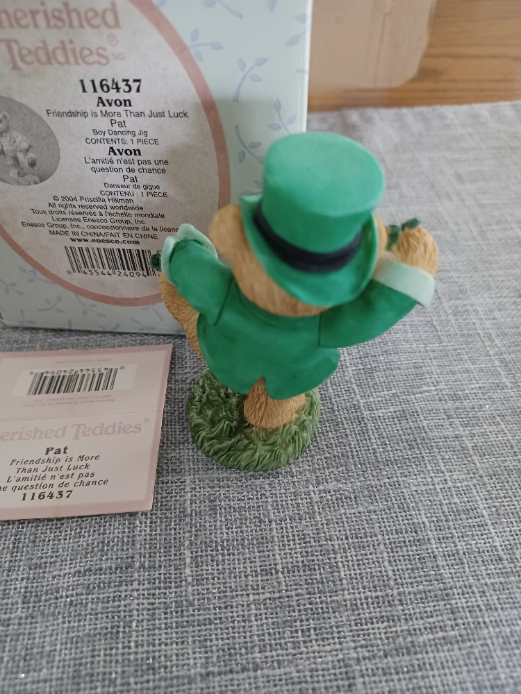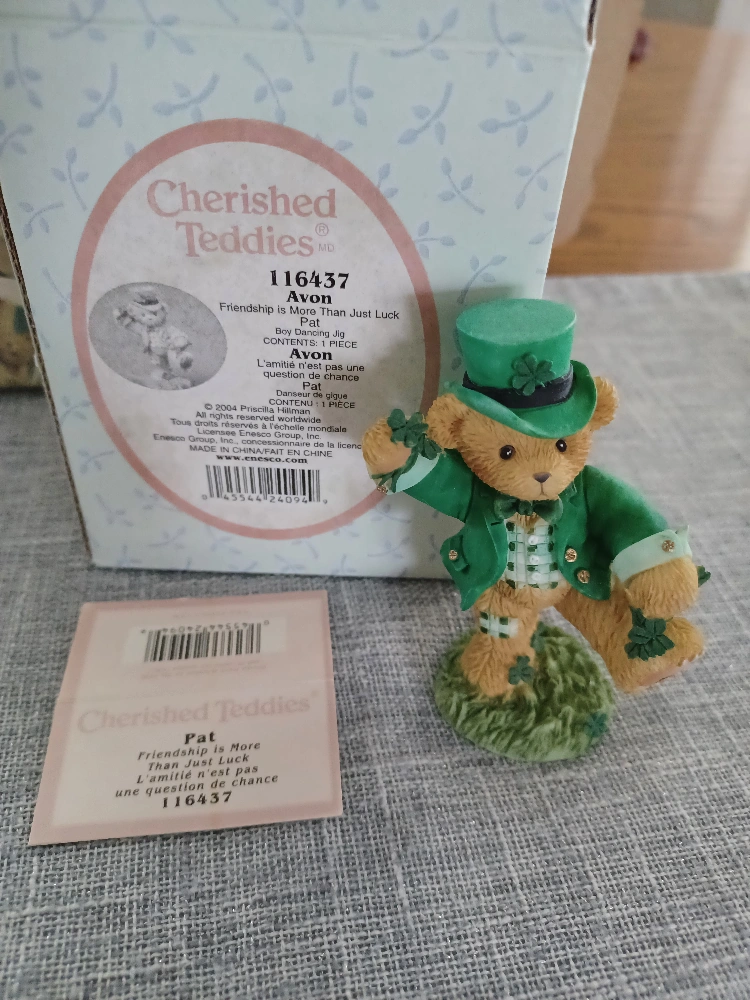 A charming Cherished Teddies figurine named "Pat" #116437 dated 2004 from Avon. This adorable bear is dressed in green and ready for St. Patrick's Day. It's in great condition and comes with its original box. A delightful addition to any collection!