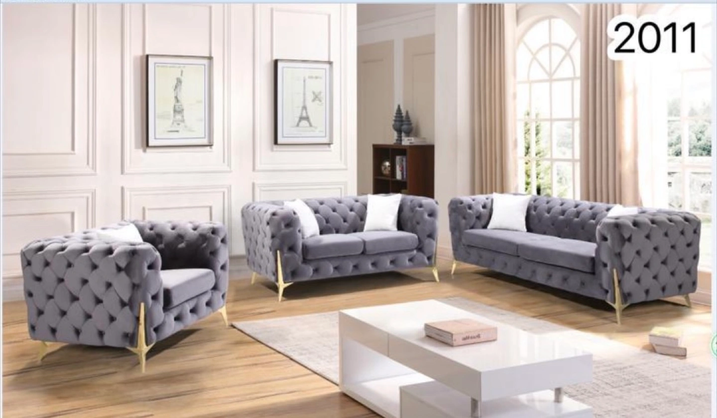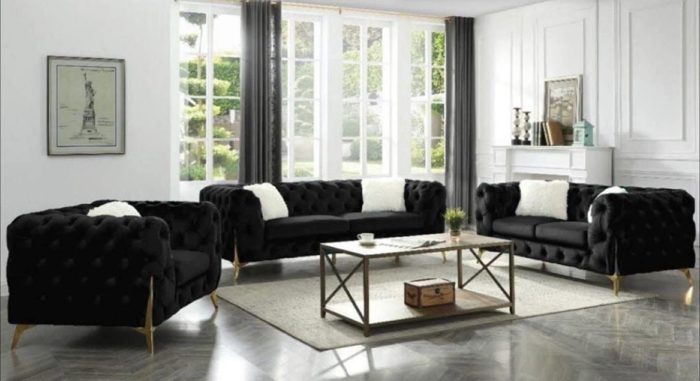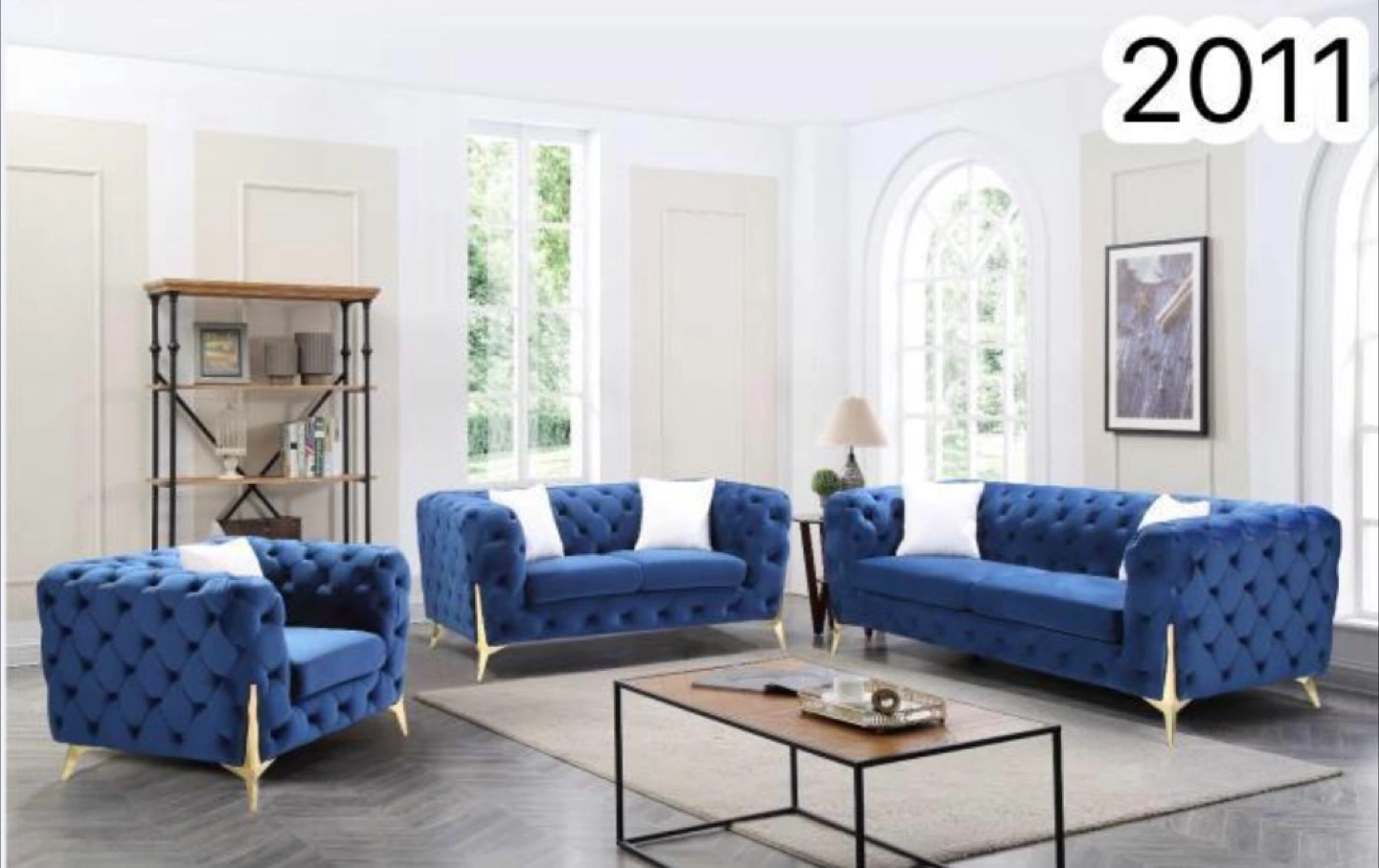 Selling a beautiful Chesterfield sofa set! It includes a sofa, loveseat, and armchair, all upholstered in a luxurious blue velvet. The tufted design and gold legs add a touch of elegance to any living space. Perfect for adding a classic and stylish look to your home! We do deliver call at 9056519006 Insta:Bestfurnituremississauga