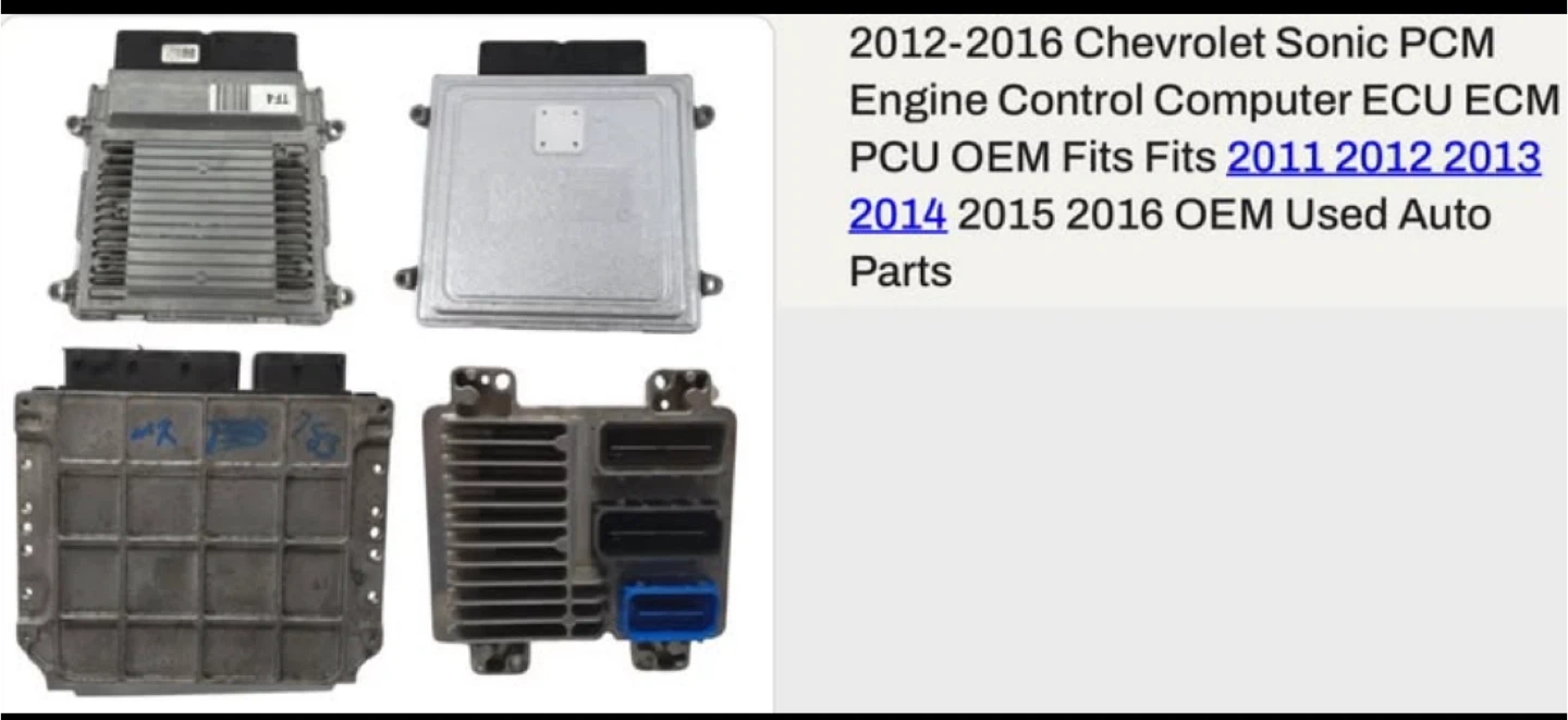 10Selling a used engine control computer (PCM) for a Chevrolet Sonic, model years 2012-2016. This is an OEM part that fits models from 2011, 2012, 2013, 2014, 2015, and 2016.