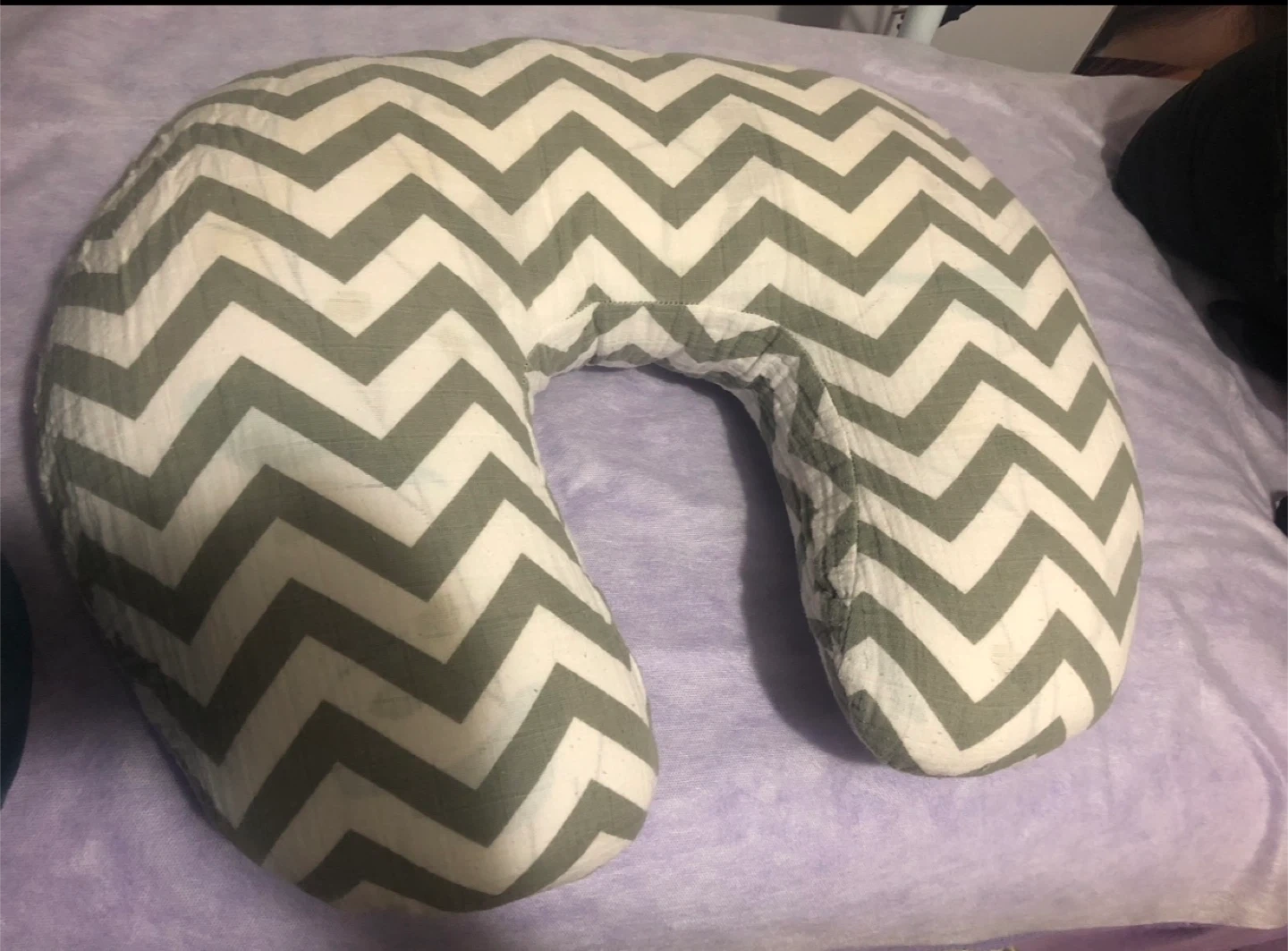 60Gently used nursing pillow with a chevron print design. It's in good condition and ready for a new home! Perfect for supporting baby during feeding time
