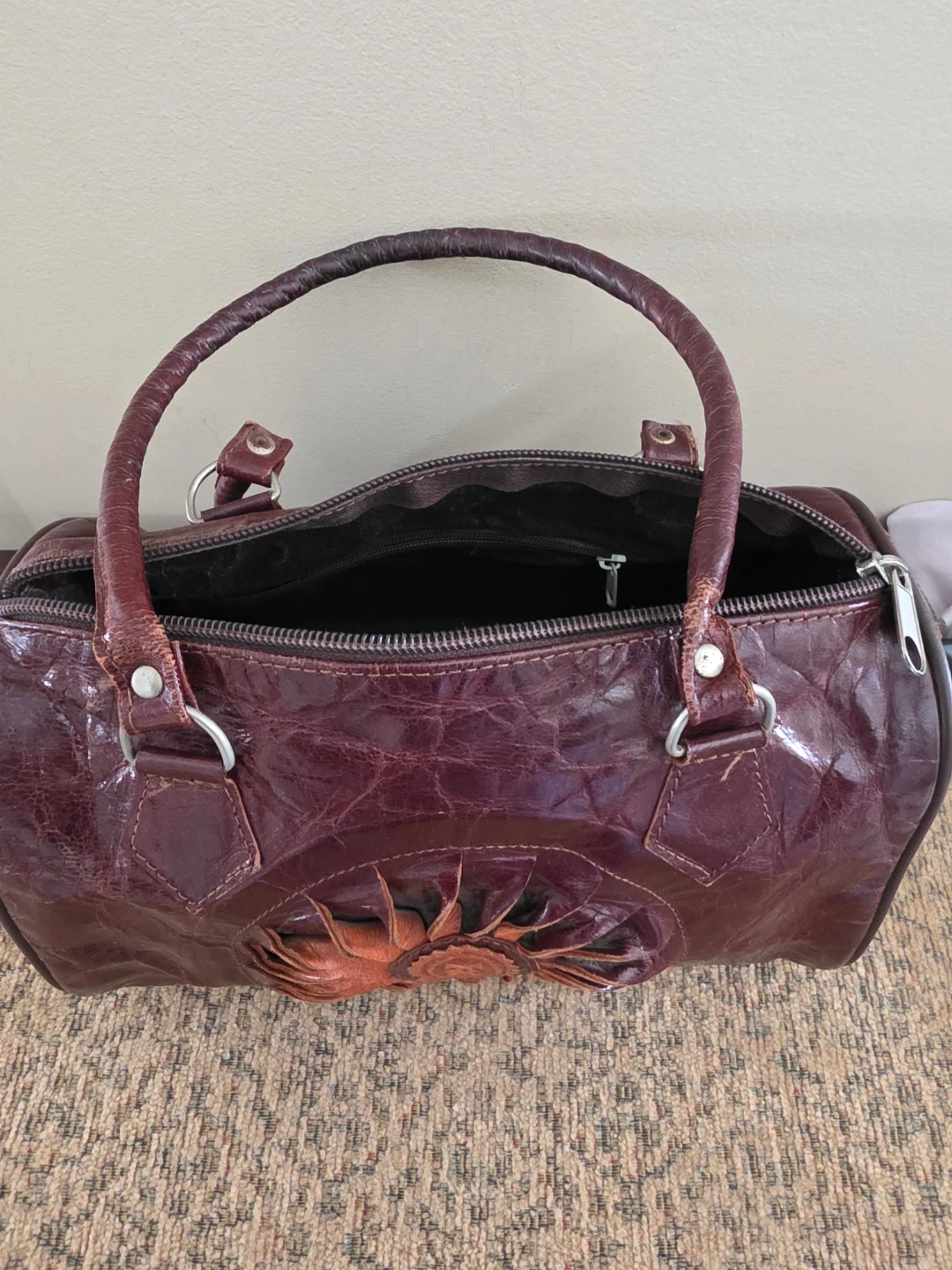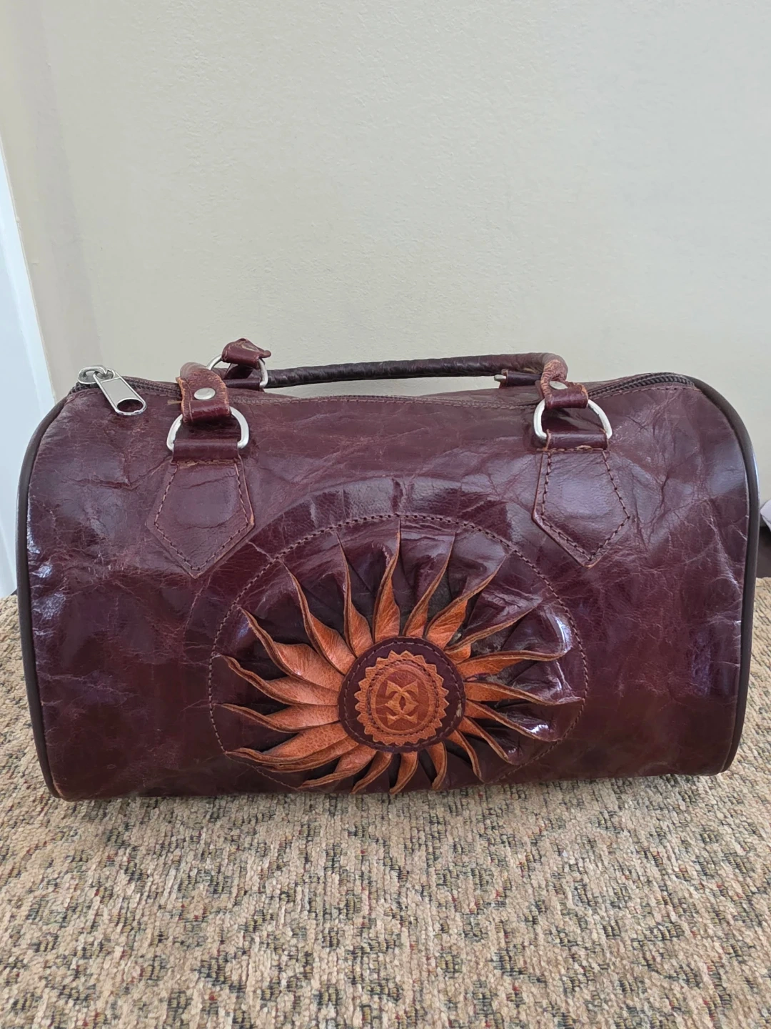This is a unique barrel-style handbag made from textured brown leather. It features a prominent, handcrafted sunflower applique on the front. The bag has a zippered closure and dual top handles. Interior shows a zippered pocket.