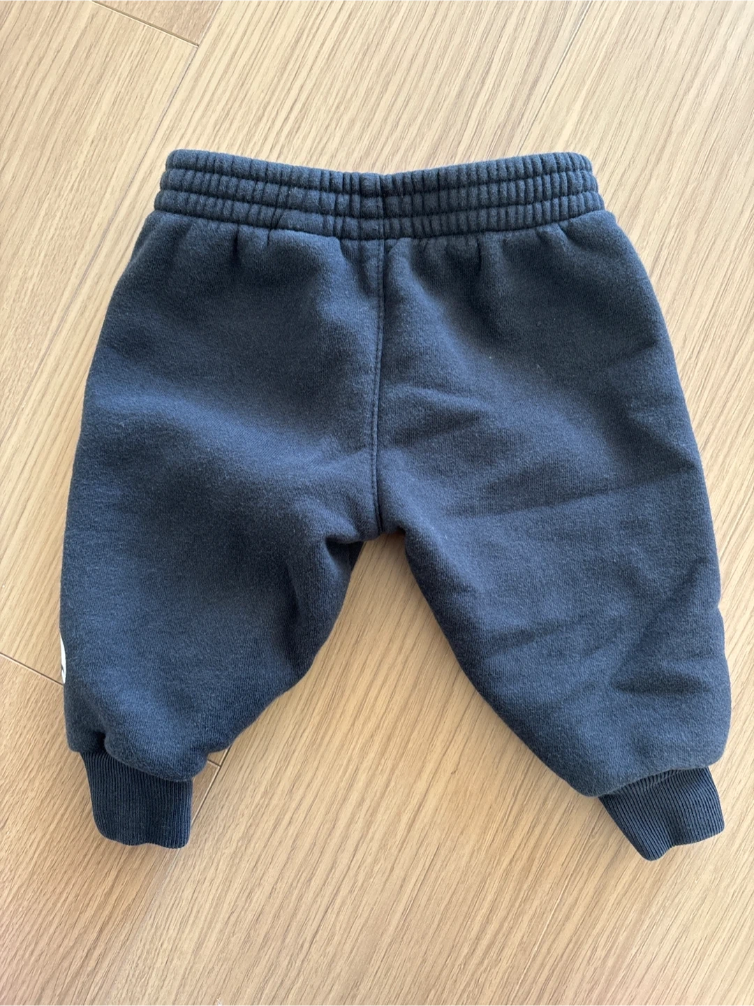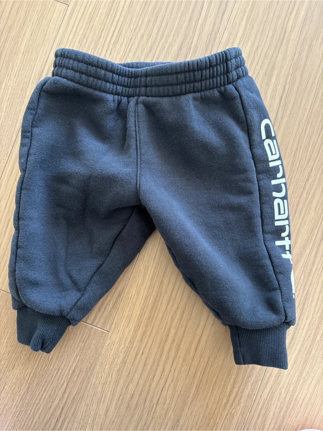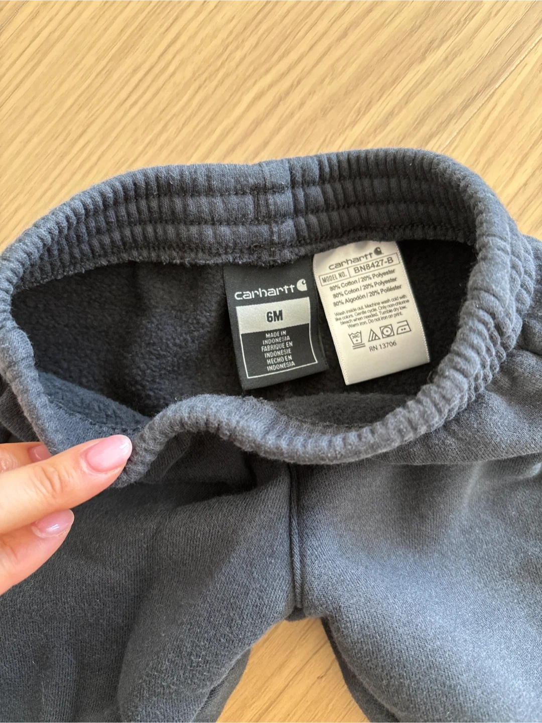 Carhartt baby jogger pants. Size 6 months. 80% cotton, 20% polyester. Jogger style with elastic waistband and cuffs. Features Carhartt logo down the side leg.