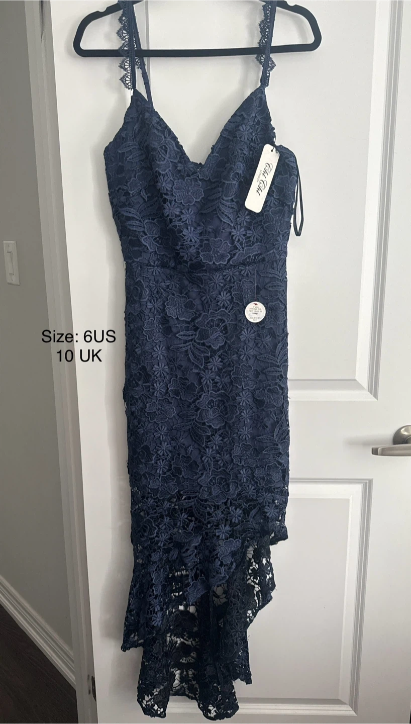 18Selling a beautiful Chi Chi London lace dress in size 6 US (10 UK). The dress features intricate lace detailing and a stylish asymmetrical hemline. Perfect for a special occasion!