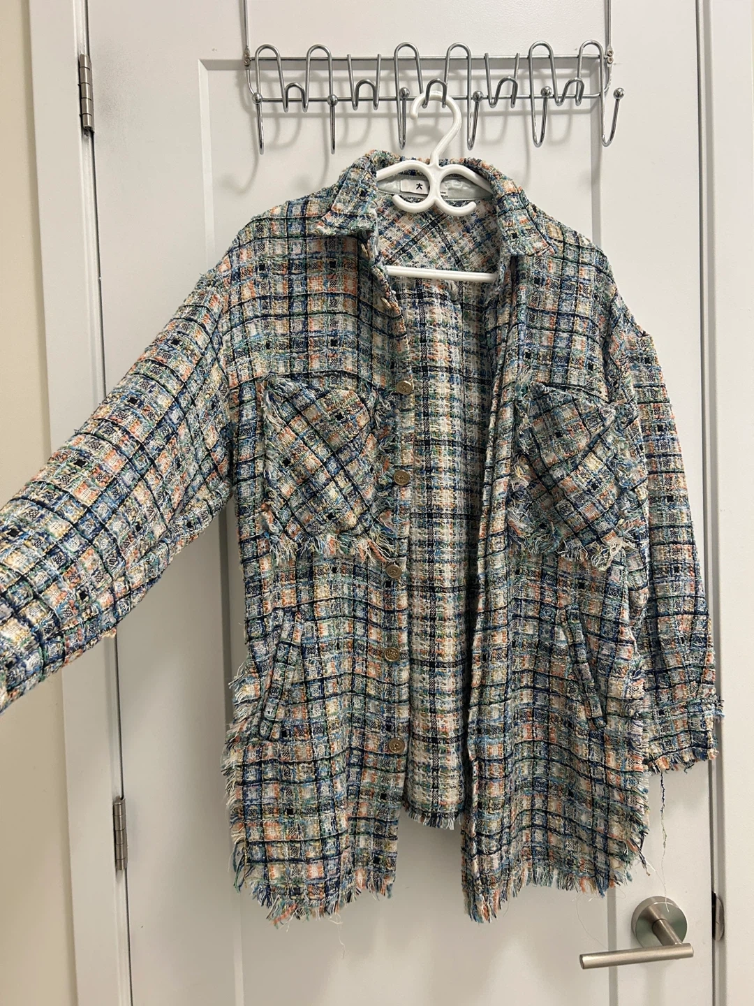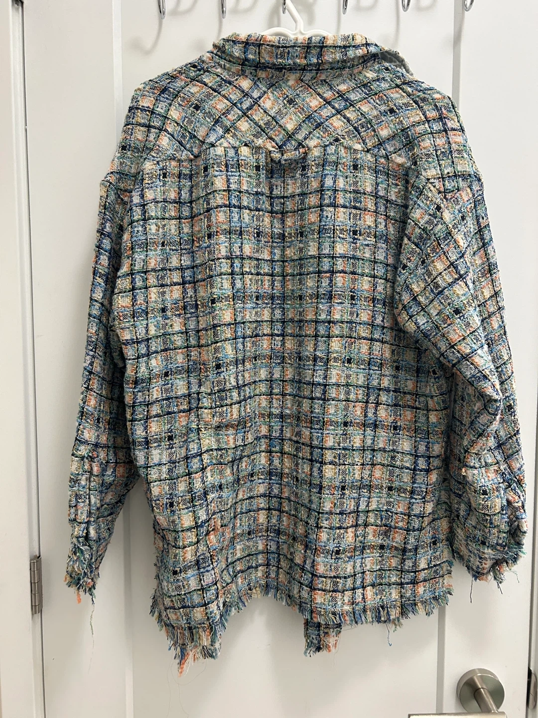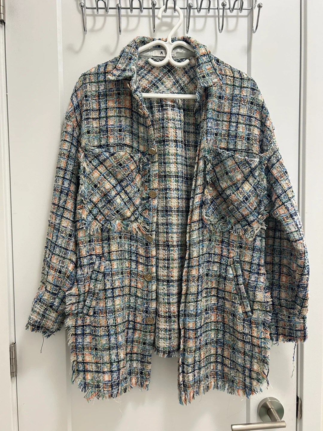 237Here's a colourful chanel style tweed jacket! It's barely worn in great condition and ready for a ✨new home✨. 🧸 The jacket features a unique woven pattern and gold-tone buttons, adding a touch of style ✨