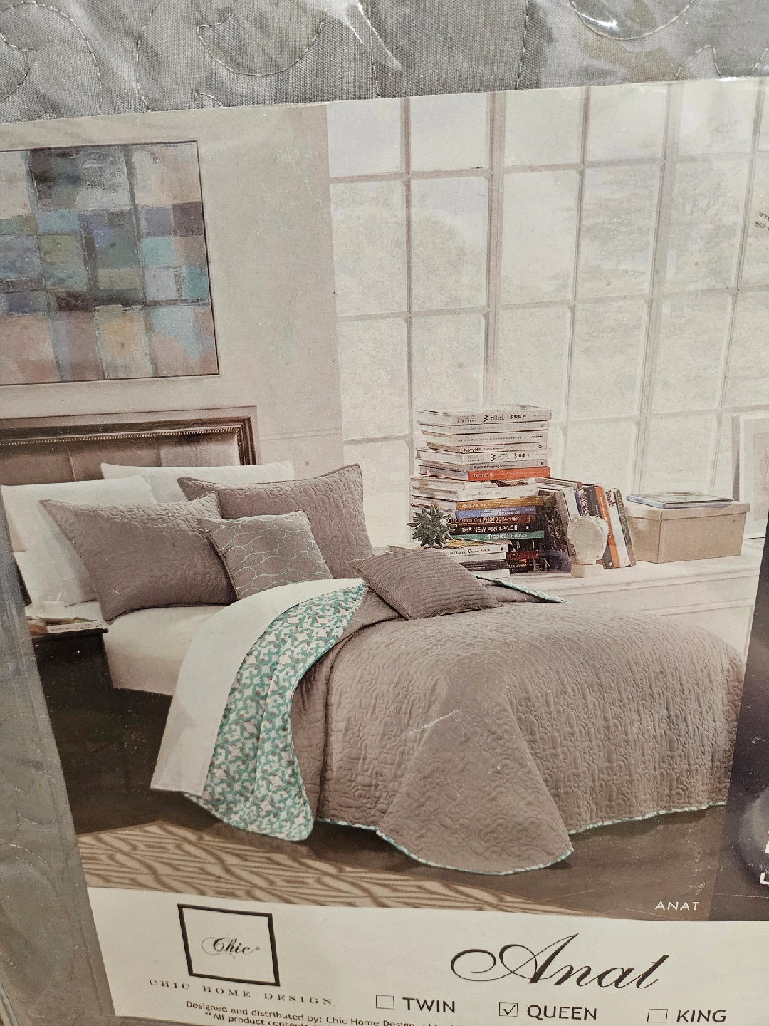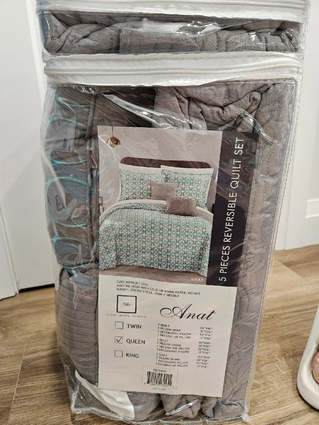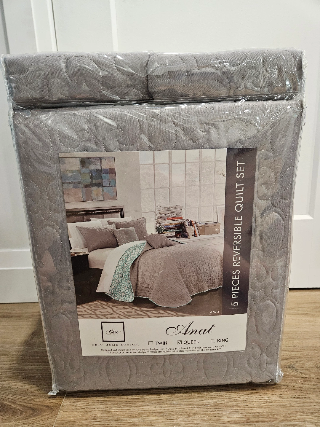 Selling a Chic Home Design Anat 5-piece reversible quilt set, size queen! It's still in the original packaging. The set includes 1 quilt (86"x86"), 2 pillow shams (20"x26"), 1 decorative pillow (16"x16"), and 1 decorative pillow (12"x18")