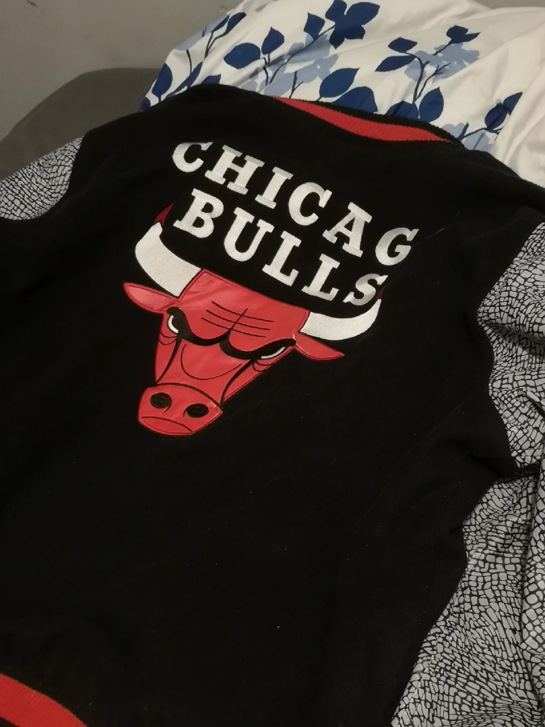 65Selling a Chicago Bulls varsity jacket. It's black with a red and white logo. The sleeves have a grey and white patterned design. Great for showing off your team spirit!