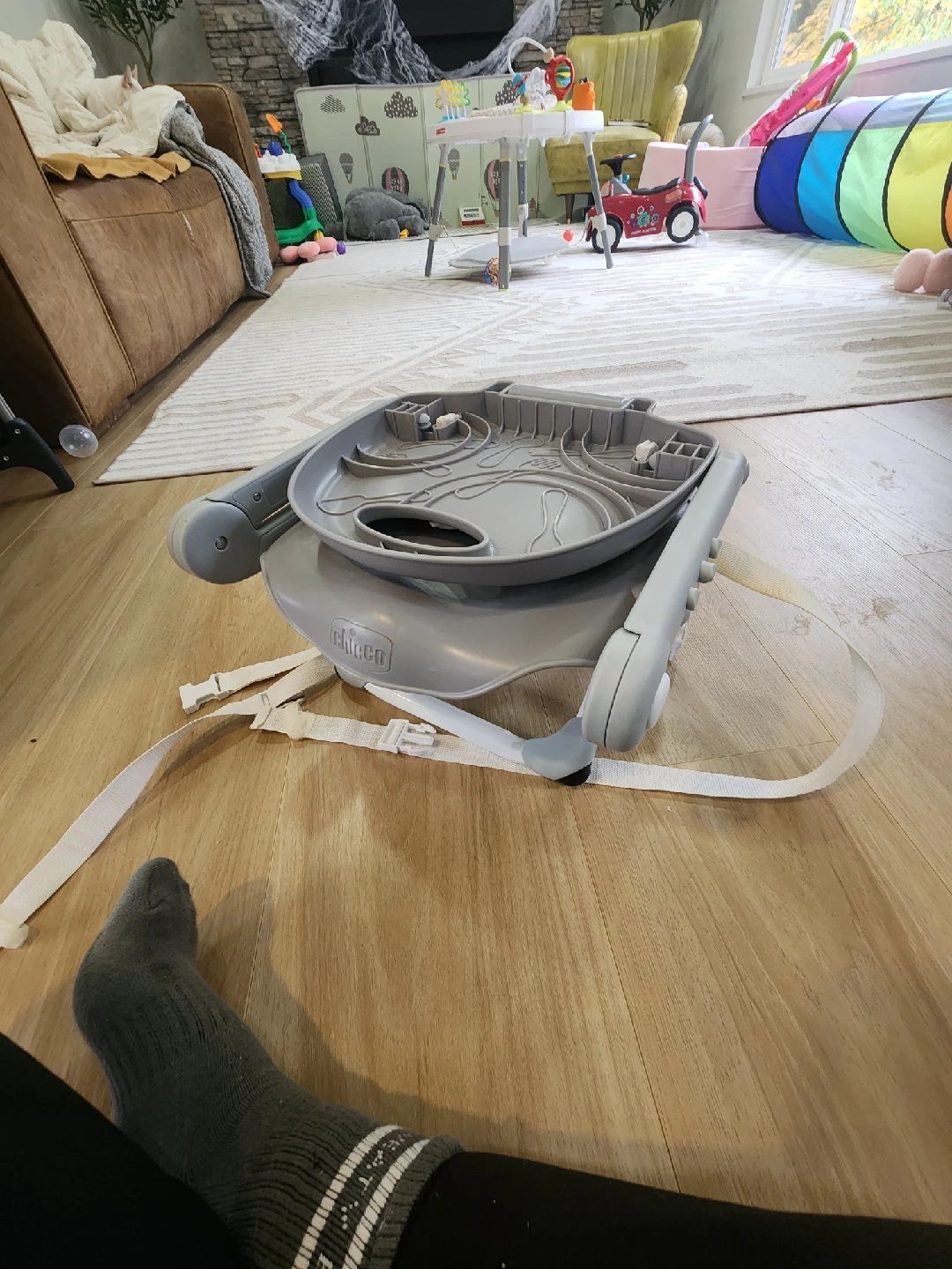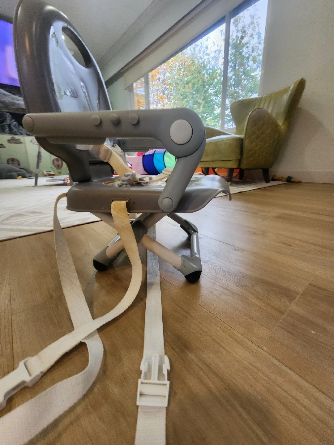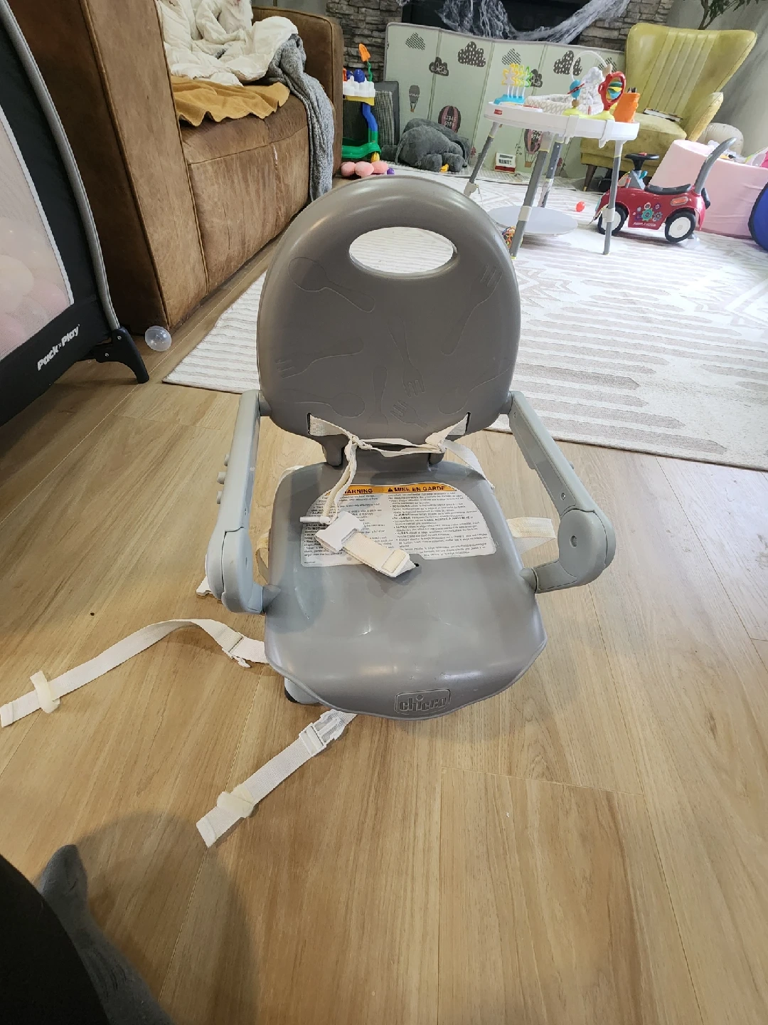 12Selling a Chicco portable foldable high chair! It's in great shape and ready for a new home. Perfect for meal times or playtime at the table. It's grey in colour and has straps to secure it to a chair.