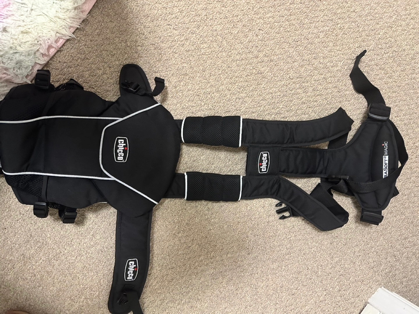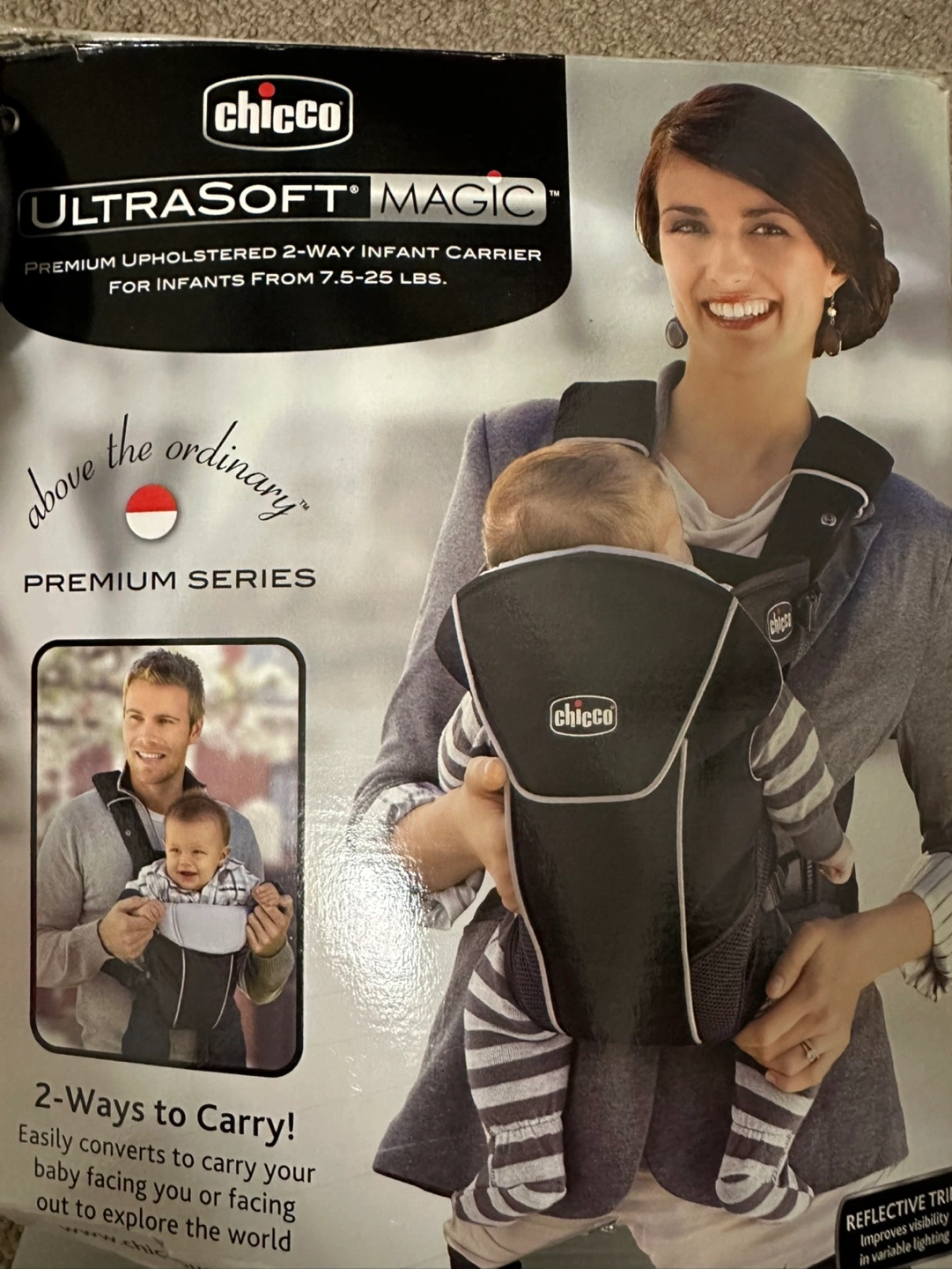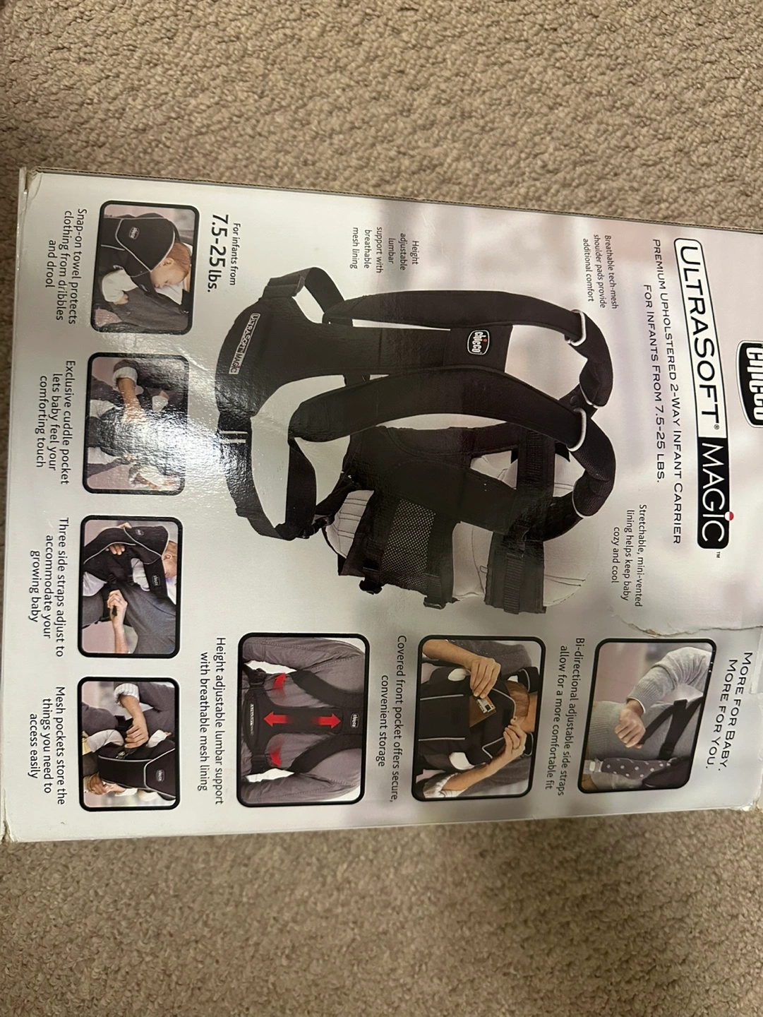 Black infant carrier. 2-way carry. Adjustable straps. Includes carrying pouch.