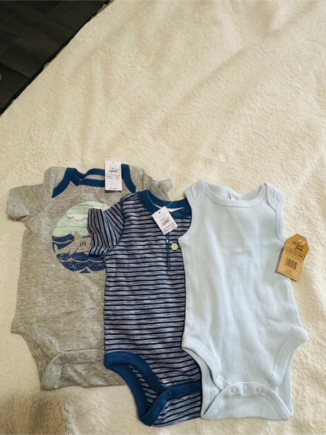 68Here are three Chick Pea baby bodysuits, perfect for your little one! They are size 3-6 months and in new condition with tags still attached. One is grey with a shark design, another is blue striped, and the third is light blue