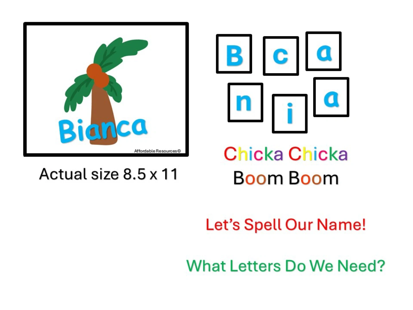 124Engaging from the book Chicka Chicka Book Boom learn to spell your name with letter boxes and the Chicka Chicka Tree card. Size is 8.5 x 11. This PDF file sells for $1.00. Message if interested.