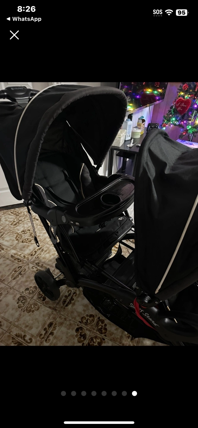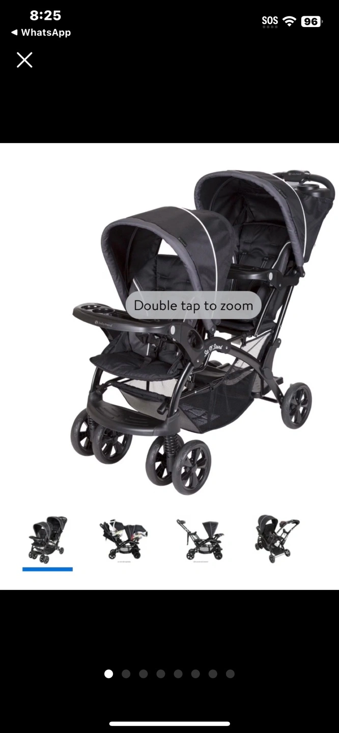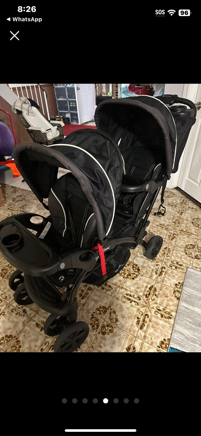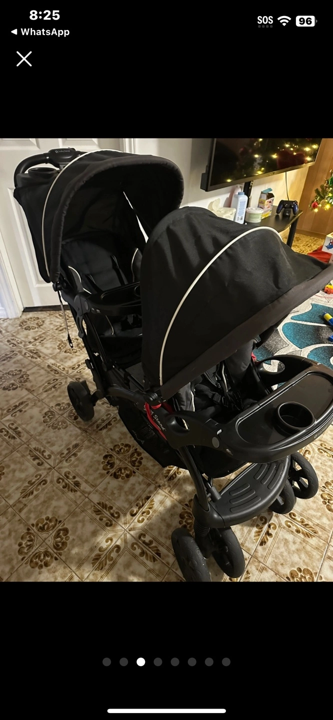 29Double stroller, black and grey. Features two canopies and a parent tray. Suitable for two children.