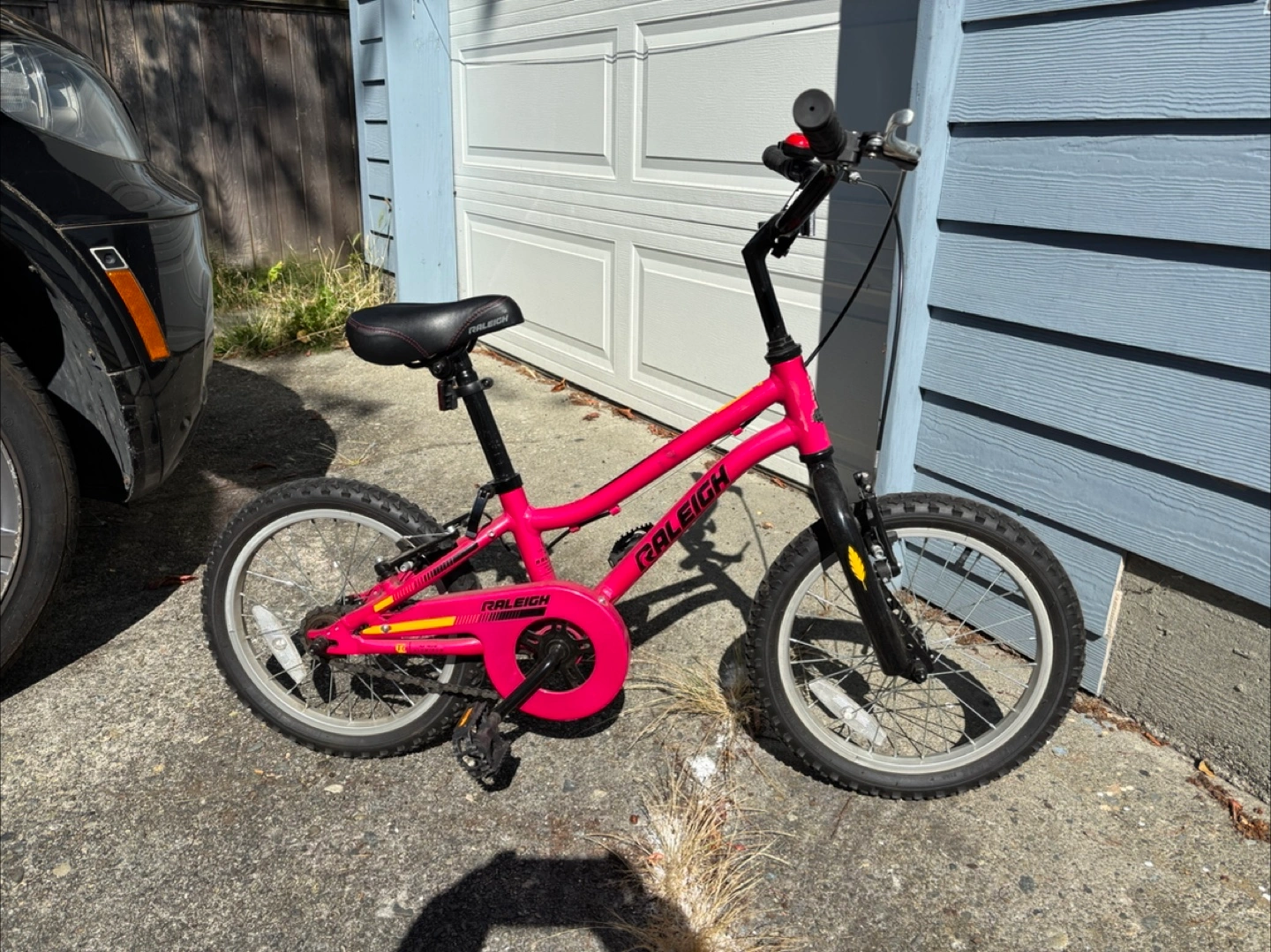 Children’s Bicycle Raleigh Vibe, Pink with 16” wheels, hand operated brakes, can accommodate child up to 125cm tall.