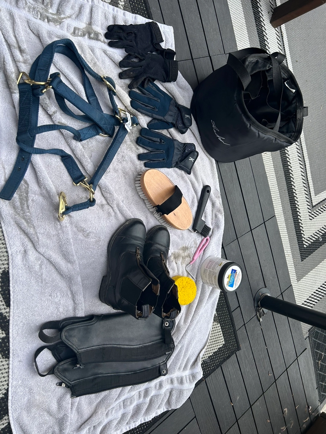 Selling a bundle of equestrian gear! Includes: - Troxel helmet (size S) - Ovation ComfortFlex body protector vest - Riding boots - Gloves - Chaps - Other accessories like brushes and tack Items can be sold separately or as a bundle. Helmet- $40 Protector Vest- $70 Riding Boots- size 3 youth- $30 Bundle- $150