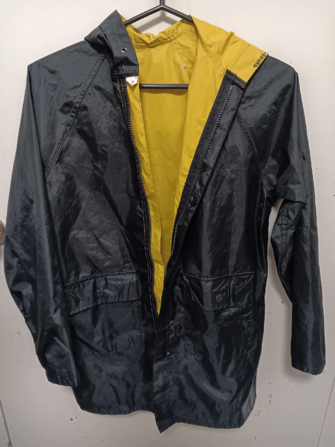 Selling a child's rain jacket in great condition! One side is black and the other is yellow. It's a size 14 and perfect for those rainy days. It has a hood for extra protection from the elements