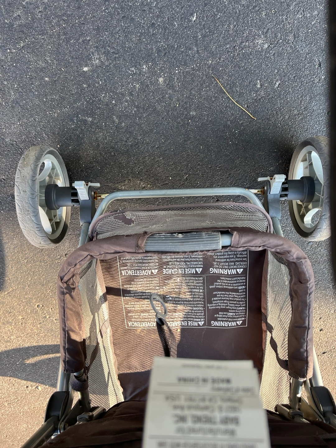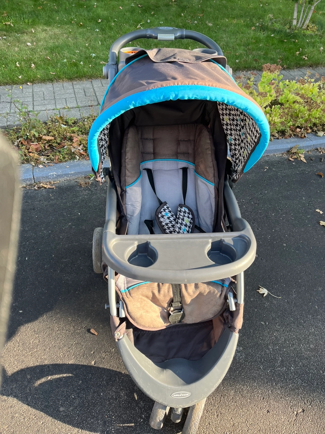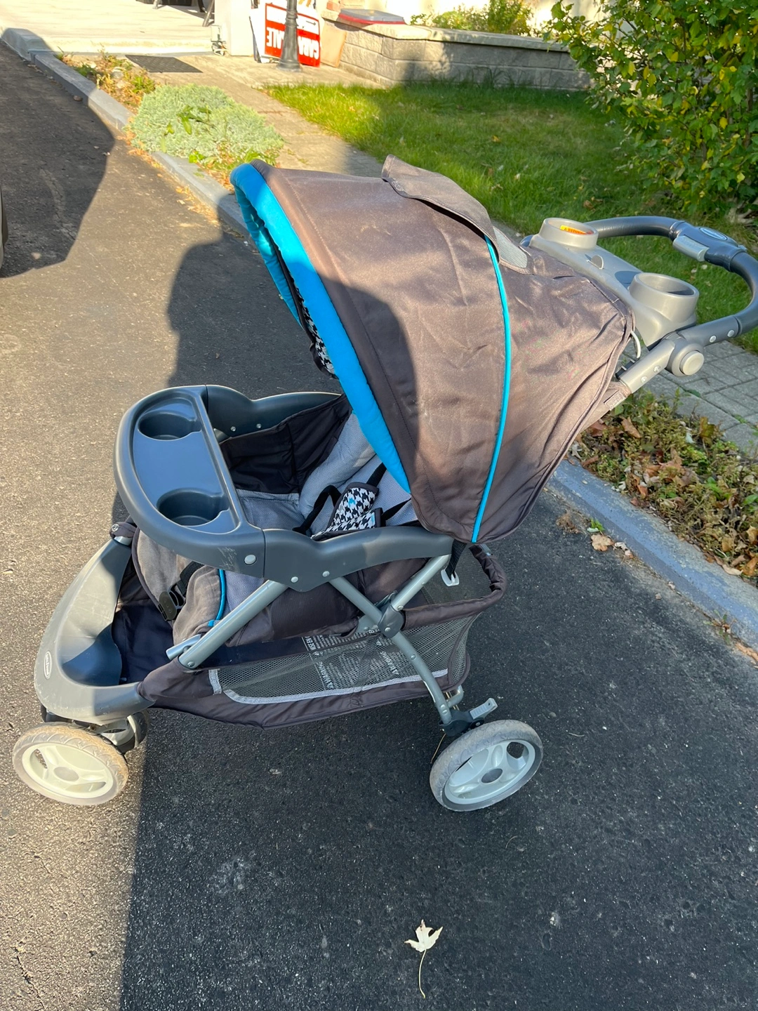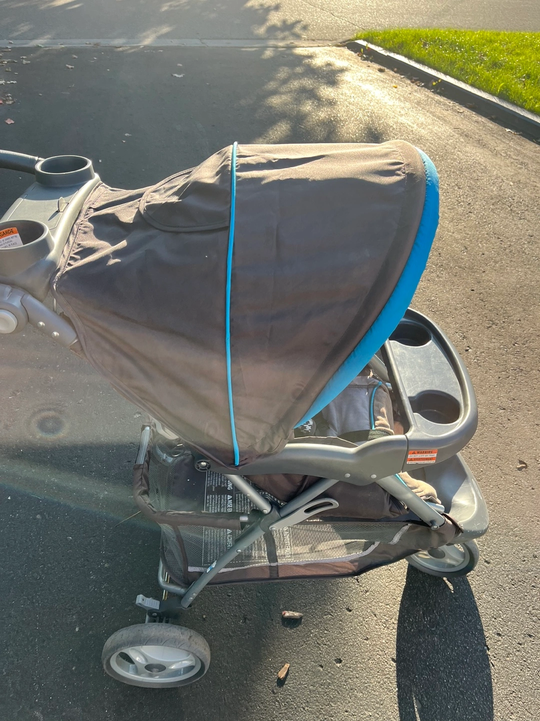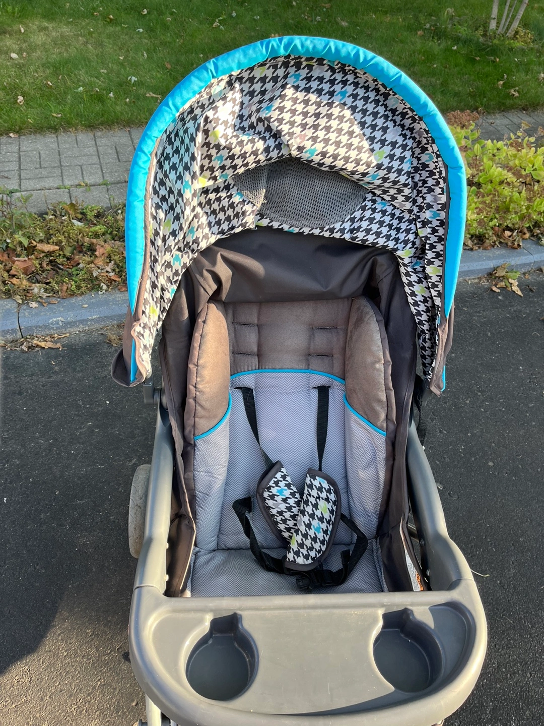 Stroller with blue canopy and grey and black patterned seat. Has a storage basket and cup holders. Very good condition. Used for one child. Has 2 tears on lower mesh basket.
