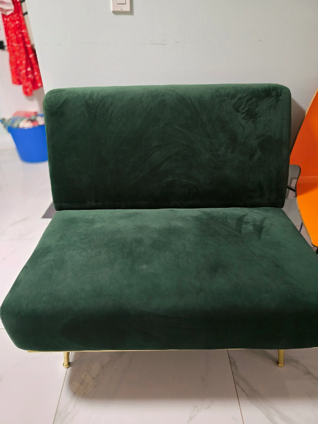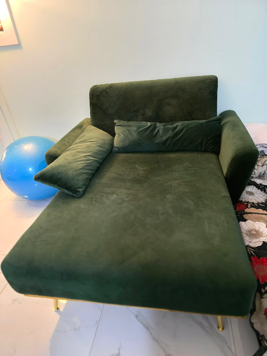 10Selling a comfy green velvet sectional sofa! It's in great condition and would look lovely in any living space. Perfect for relaxing and adding a touch of elegance to your home. It can be used as love seat and lounge seat as well. Available for pickup only. Price is non-negotiable.