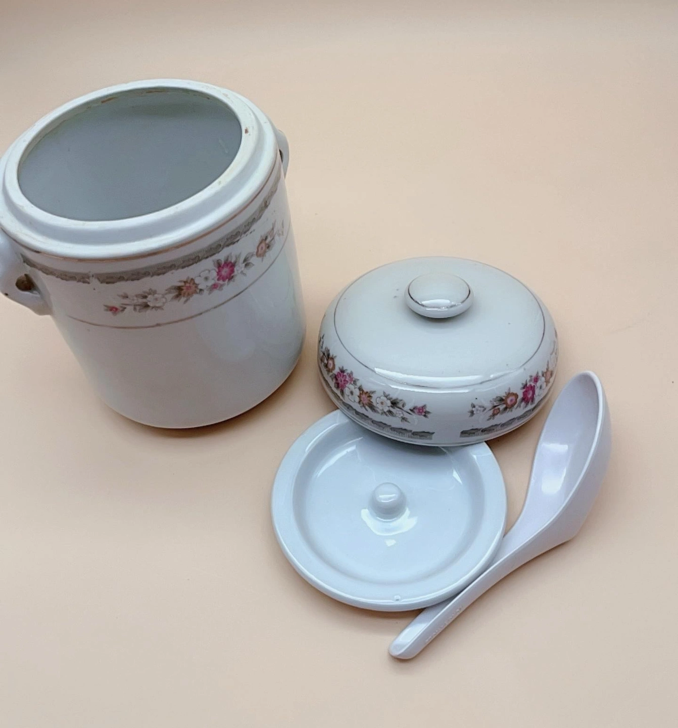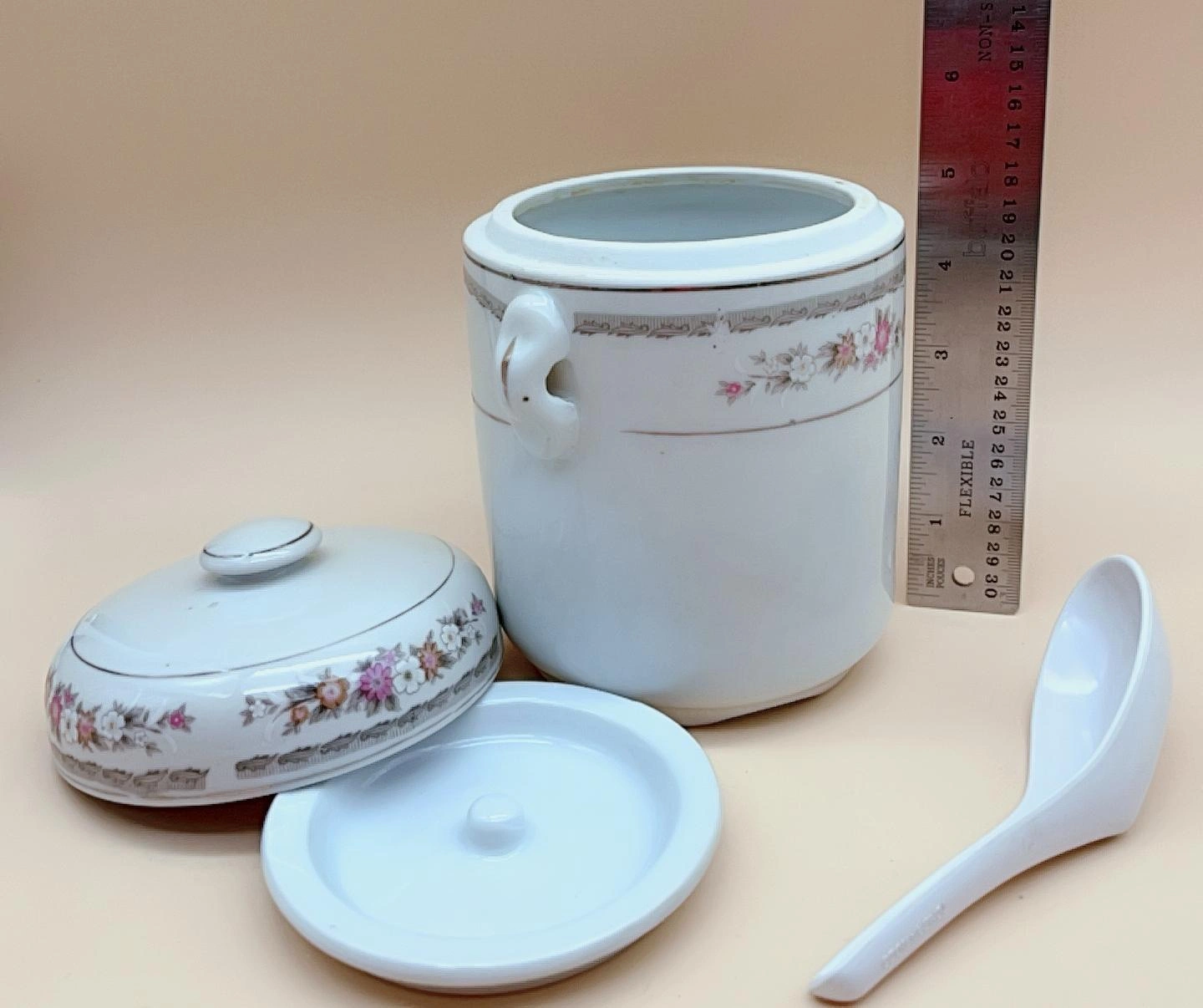 vintage ceramic container with a floral design, accompanied by a matching lid, a smaller lid or plate, and a white spoon. A ruler beside it indicates the container is about 15 cm tall. The delicate flower patterns add a classic, elegant touch. 🌸 Gentle simmering of soups and herbal broths. The floral design adds a classic touch, and it usually comes with a matching lid and spoon.