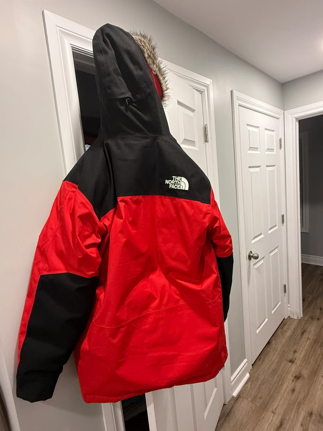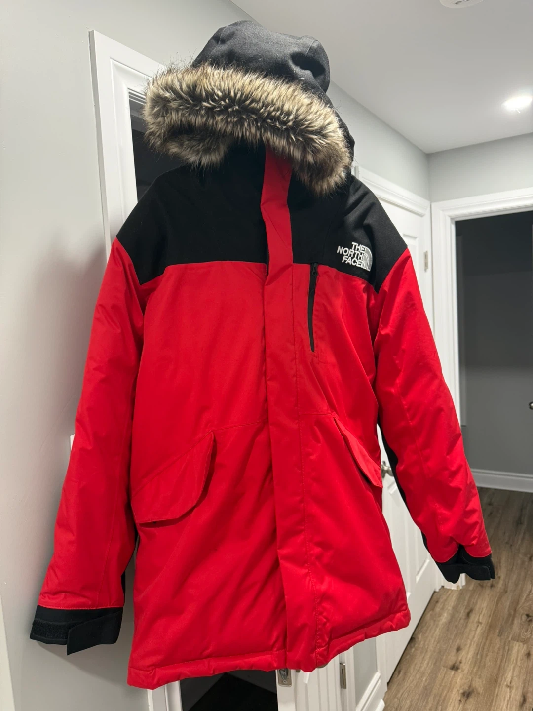 This is The North Face men's parka jacket in a size large. It's a bold red and black colourway with a faux fur-lined hood. Keeps you warm during chilly weather!
