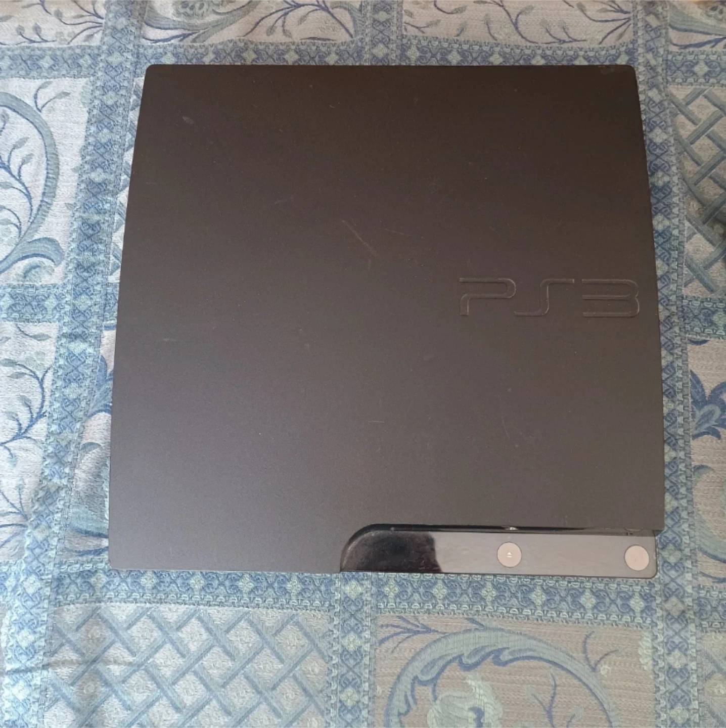 This is a black Sony PlayStation 3 console. It's a gaming system for hours of fun. It has a sleek, black design.