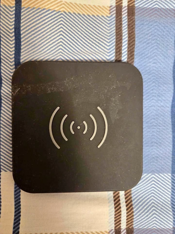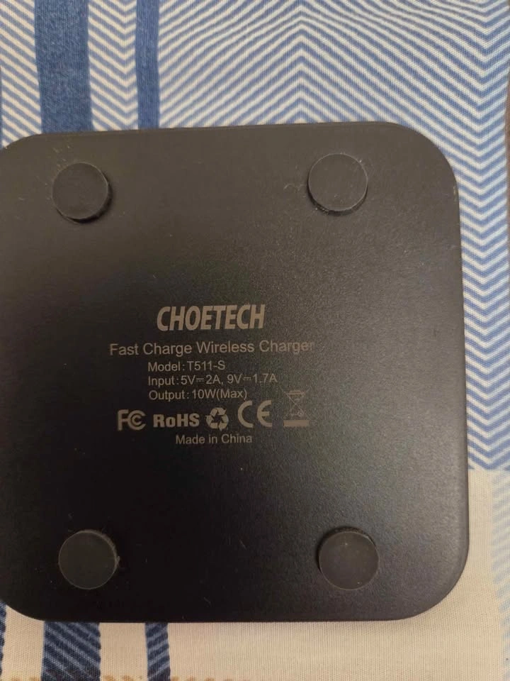 Choetech Fast Charge Wireless Charger (Model T511-S). Supports up to 10W fast charging for compatible devices. Works with Qi-enabled phones including iPhone, Samsung Galaxy, Google Pixel, and more. Compact design with rubber grips on the bottom to prevent slipping. Cable included.