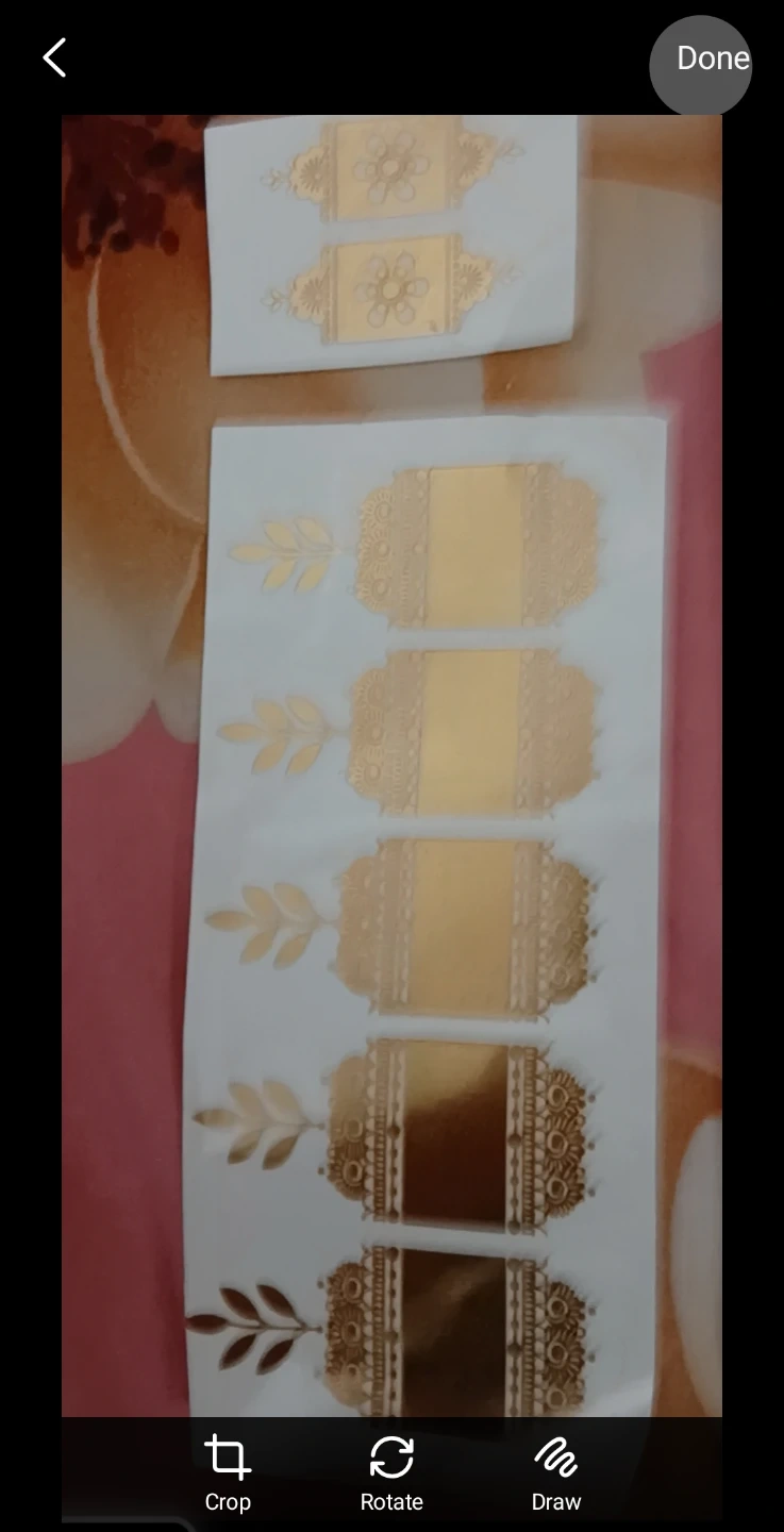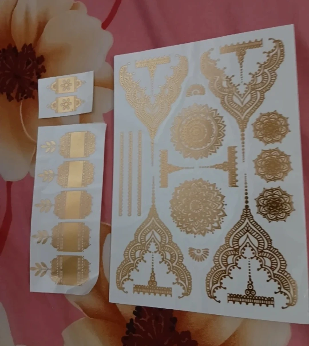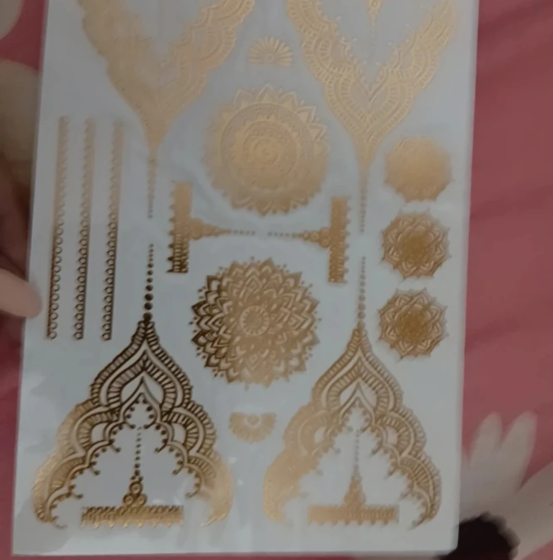 Not the best lighting but you can see its gold henna tattoos which is trendy all over pinterest ✨️ sheet of metallic gold temporary tattoos featuring intricate henna-inspired patterns. Includes various designs like mandalas and ornate borders. Great for adding a touch of sparkle to your look for special occasions or festivals!