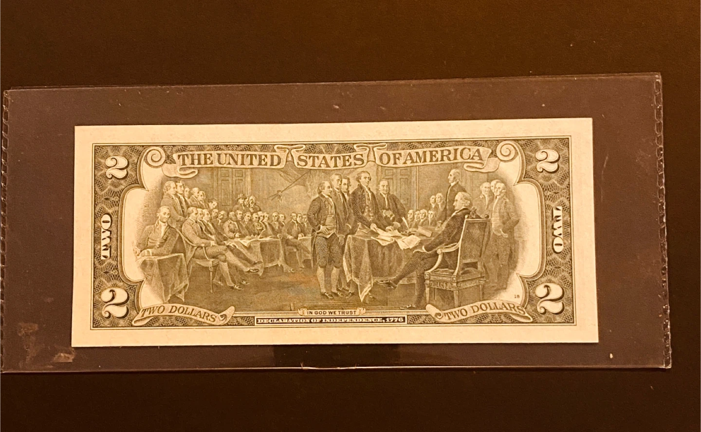 A United States two dollar bill featuring Thomas Jefferson on the front. The back depicts the Signing of the Declaration of Independence. This bill is a unique piece of currency.