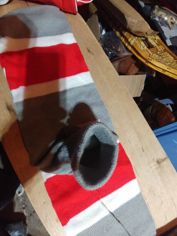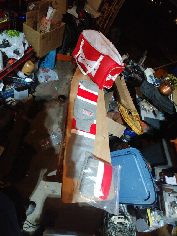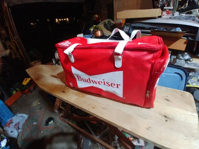 Up for sale we have these 4 Budweiser pieces we have a 2 x 24 can Cooler Bag with 2 side pocket in like new condition and we have 2 New Scarf with hand warmer 52 “ long Asking $30 for all 3 pieces Pickup on Old Richmond Road in Nepean
