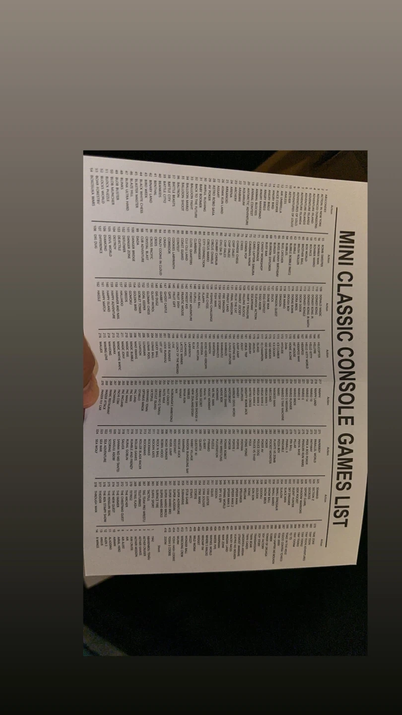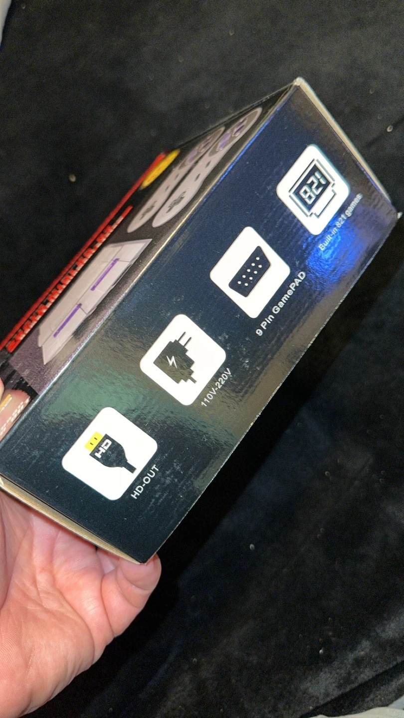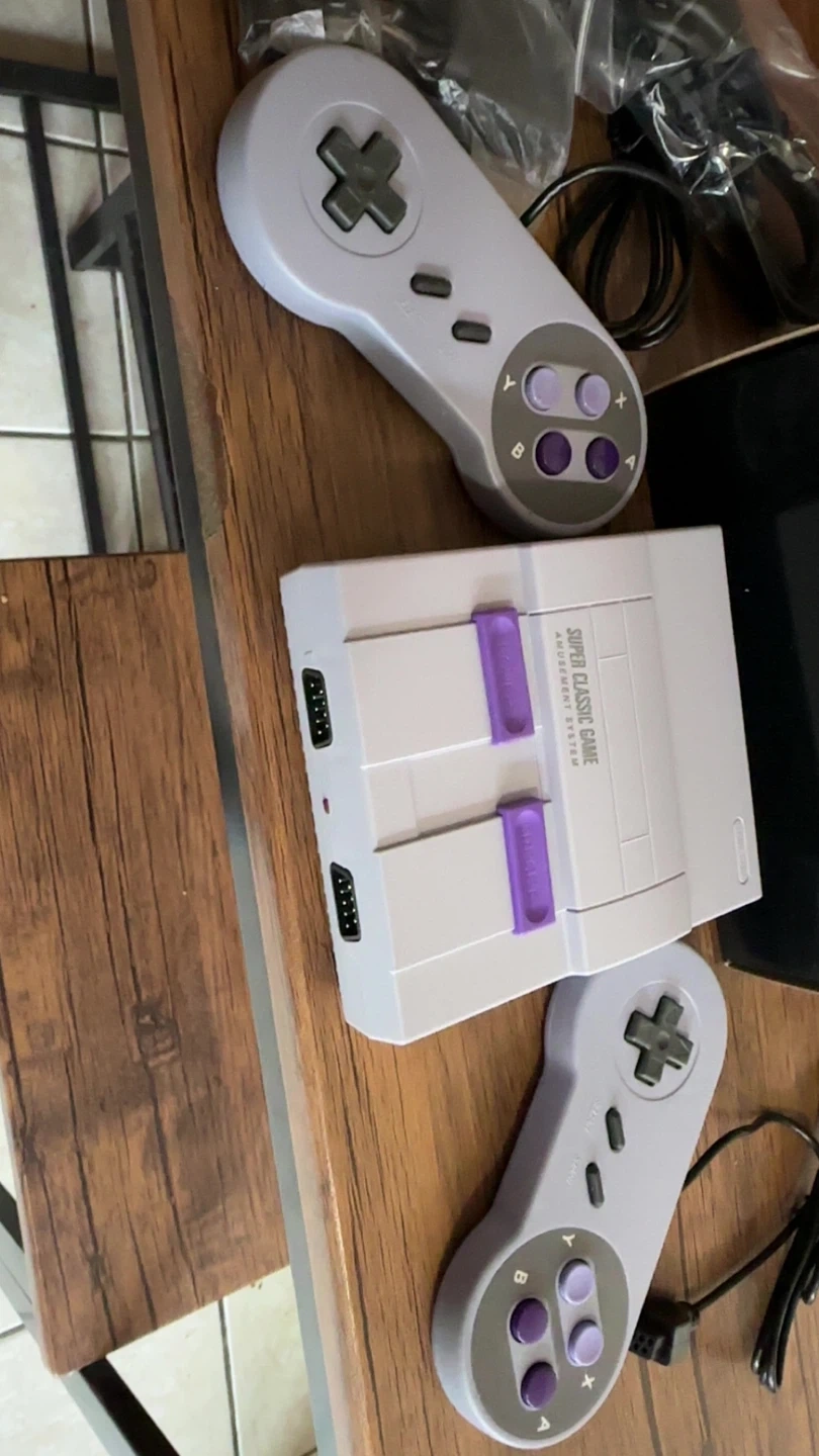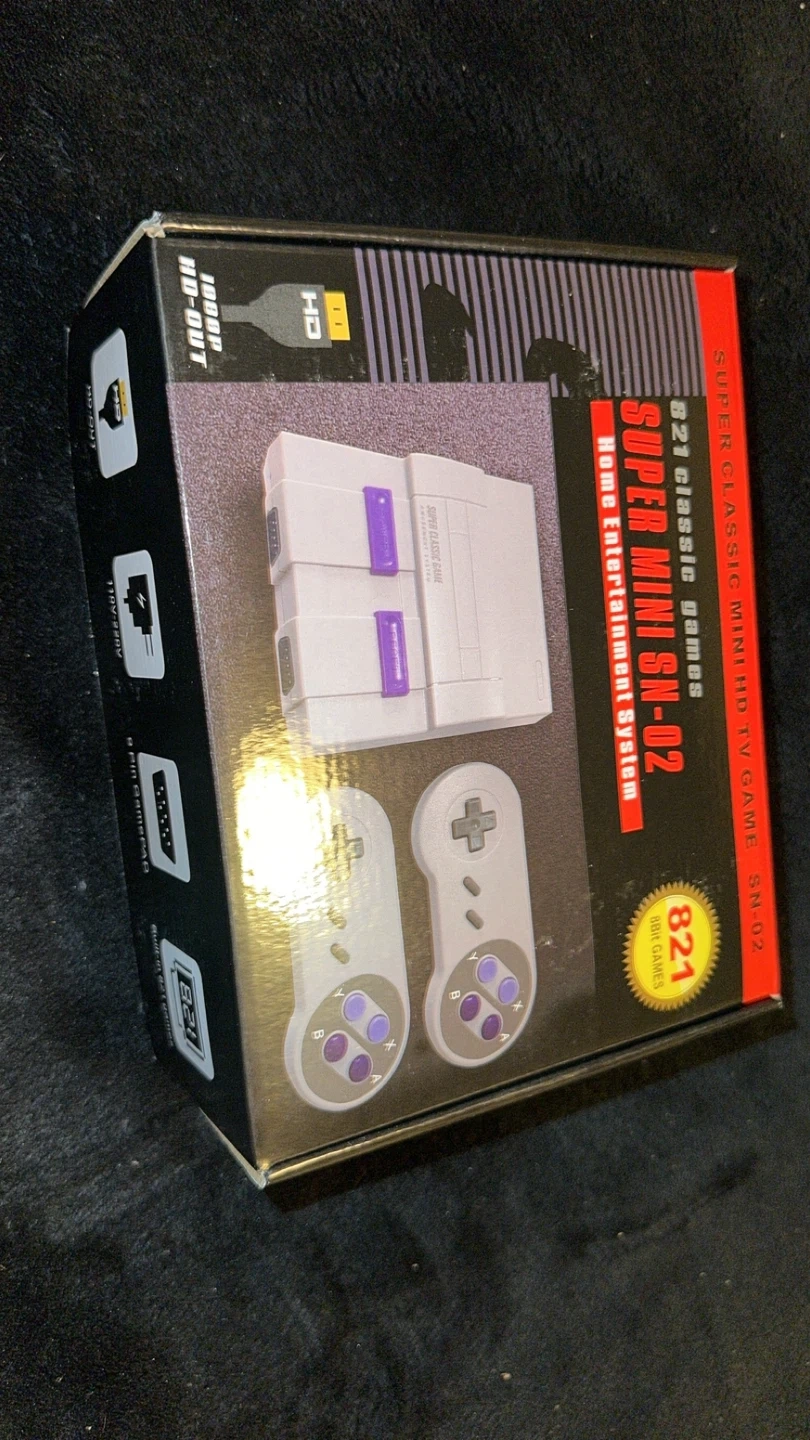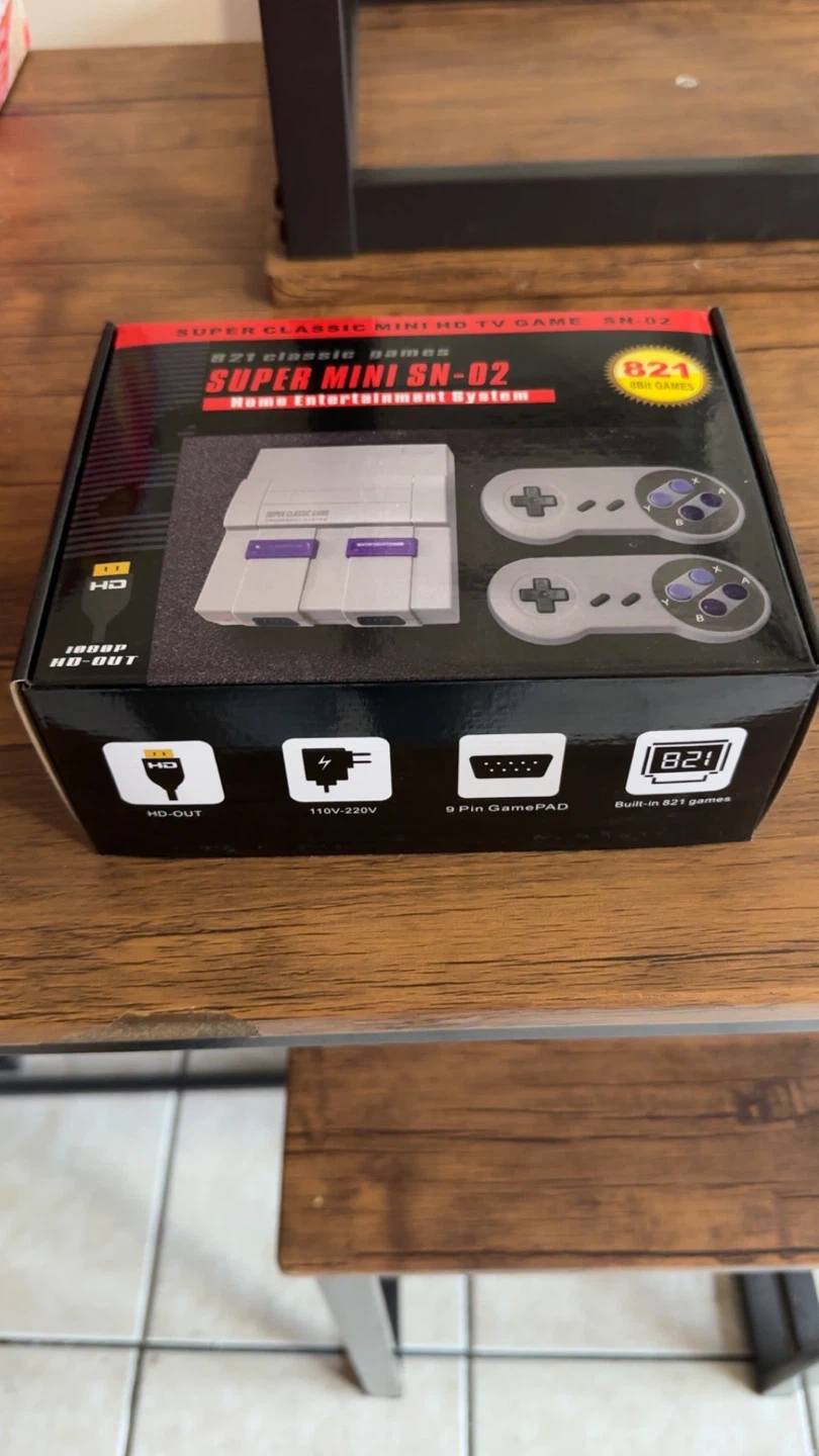 This is the Super Mini SN-02 Home Entertainment System, a classic game console. It comes with two controllers and a list of included games. The console supports HD output and operates on 110-220V.