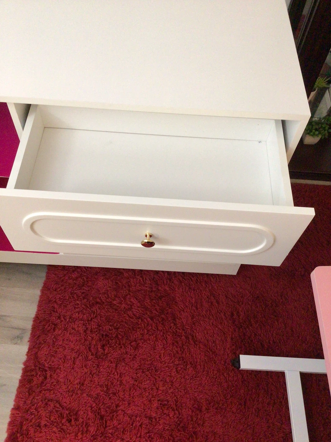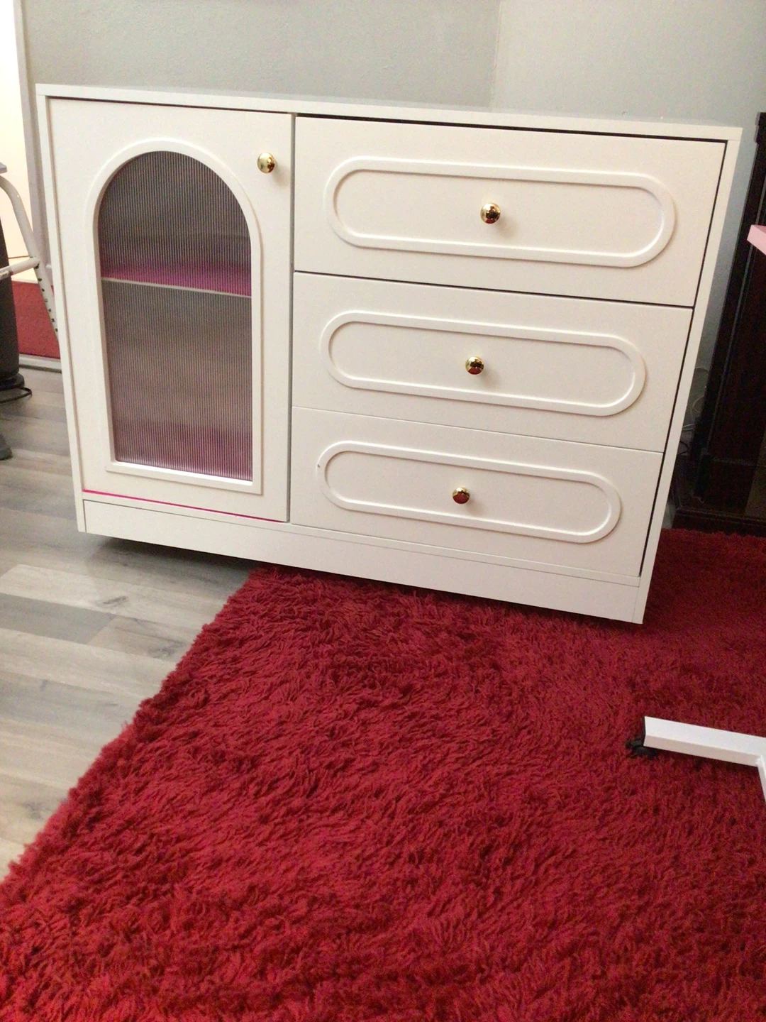 This is a white dresser with three drawers and a cabinet door. The cabinet has two shelves inside, lined with pink material. It's ideal for a bedroom or nursery. Comes with locking wheels easy to move