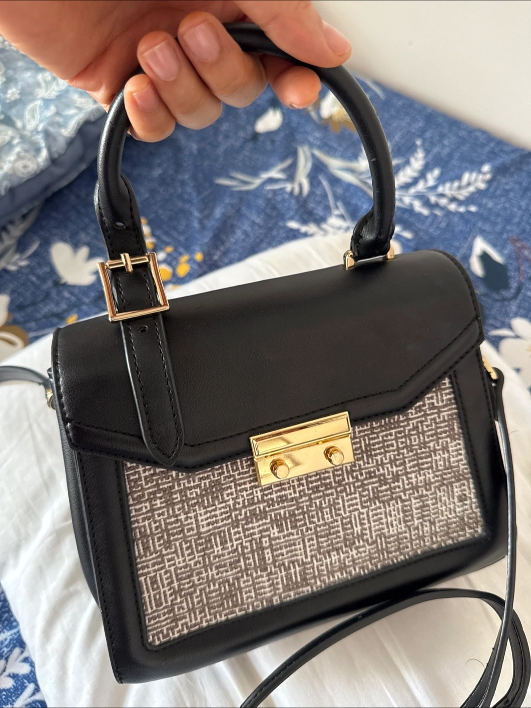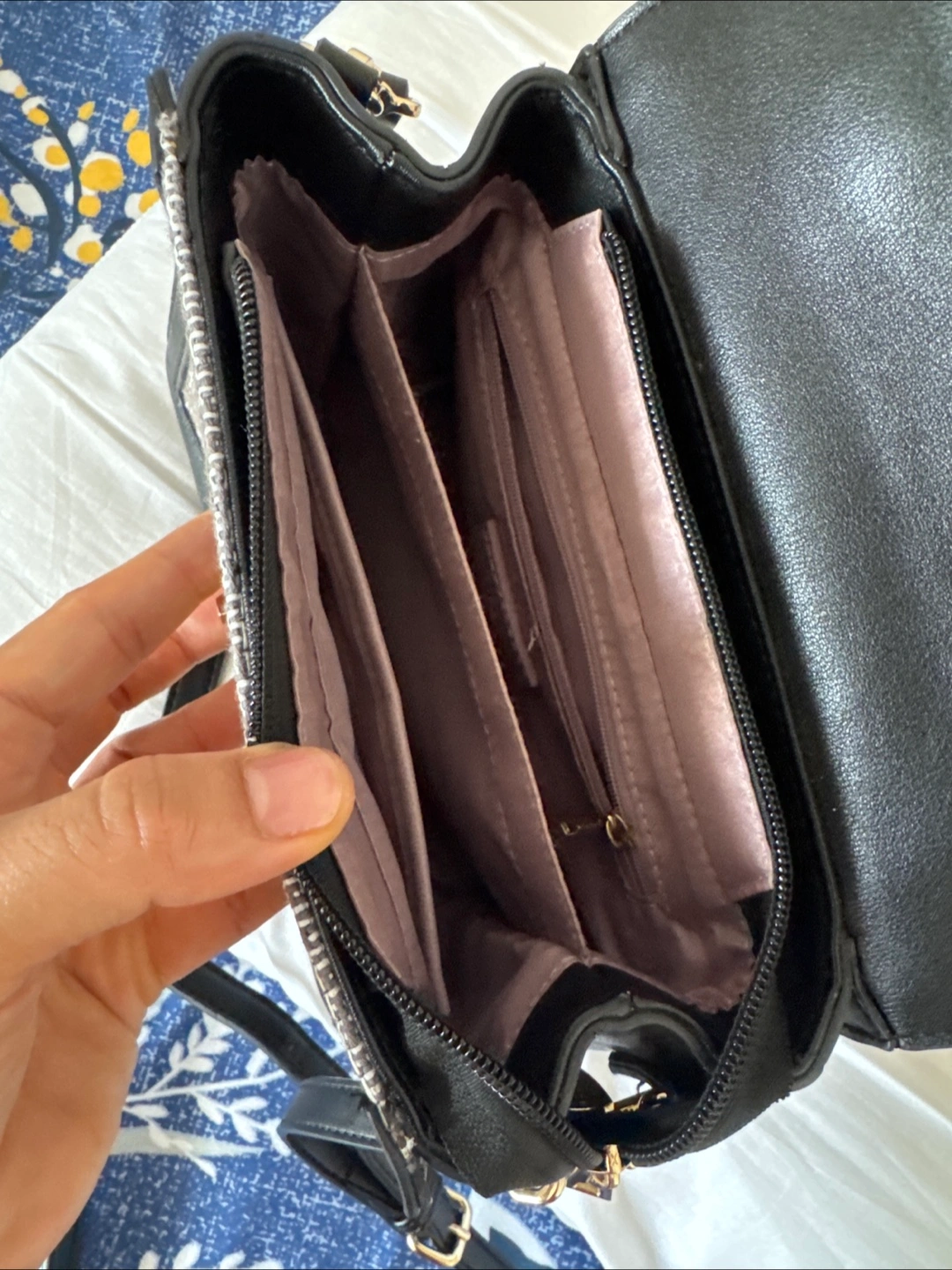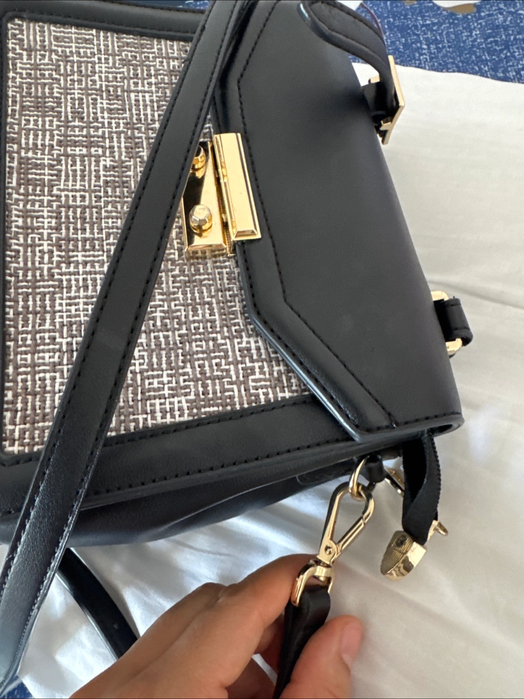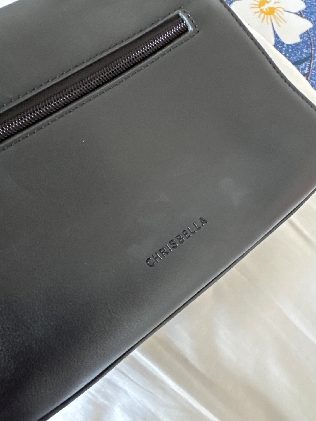 74I'm selling a cute Chris Bella crossbody bag! It's black with a woven pattern on the front. It has a detachable strap and a top handle, plus lots of compartments inside to keep everything organized. :)))