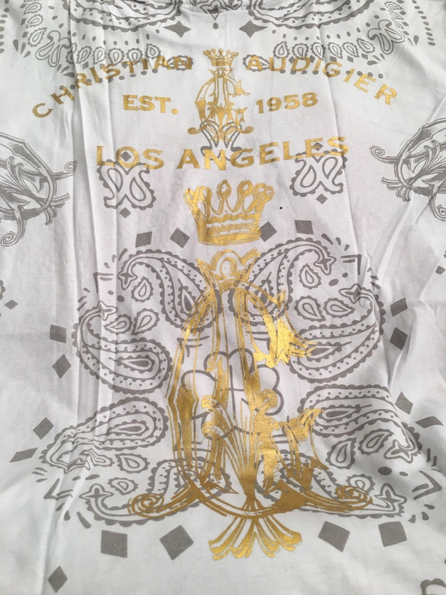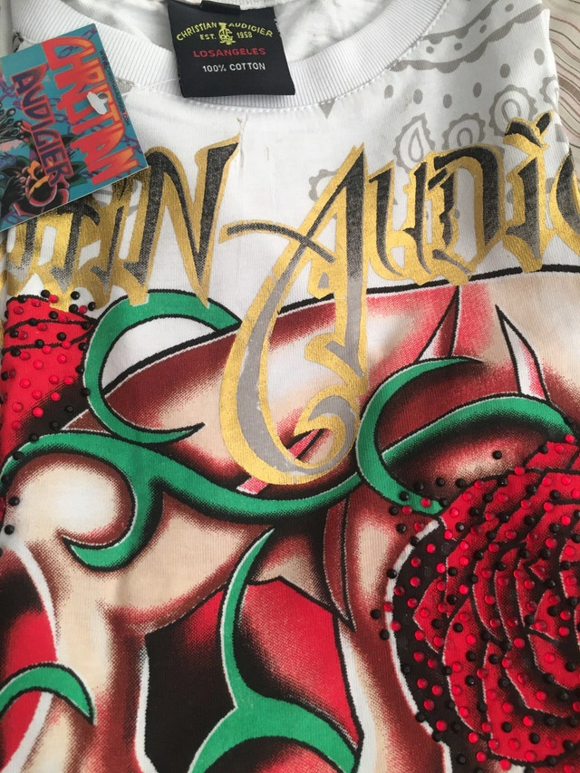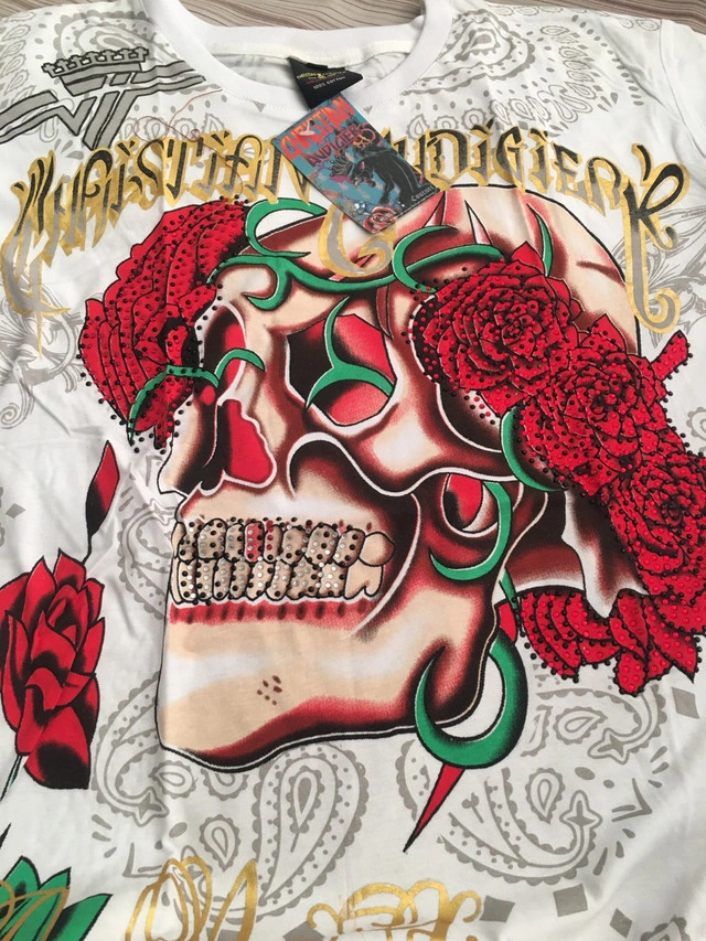 Elevate your casual wear with this new Christian Audigier T-shirt, featuring a bold skull and rose design. This eye-catching piece is 100% cotton and showcases the brand's signature Los Angeles style. Specifications: * Brand: Christian Audigier * Design: Skull and Roses * Material: 100% Cotton * Origin: Los Angeles If the ad is up, it's still available!