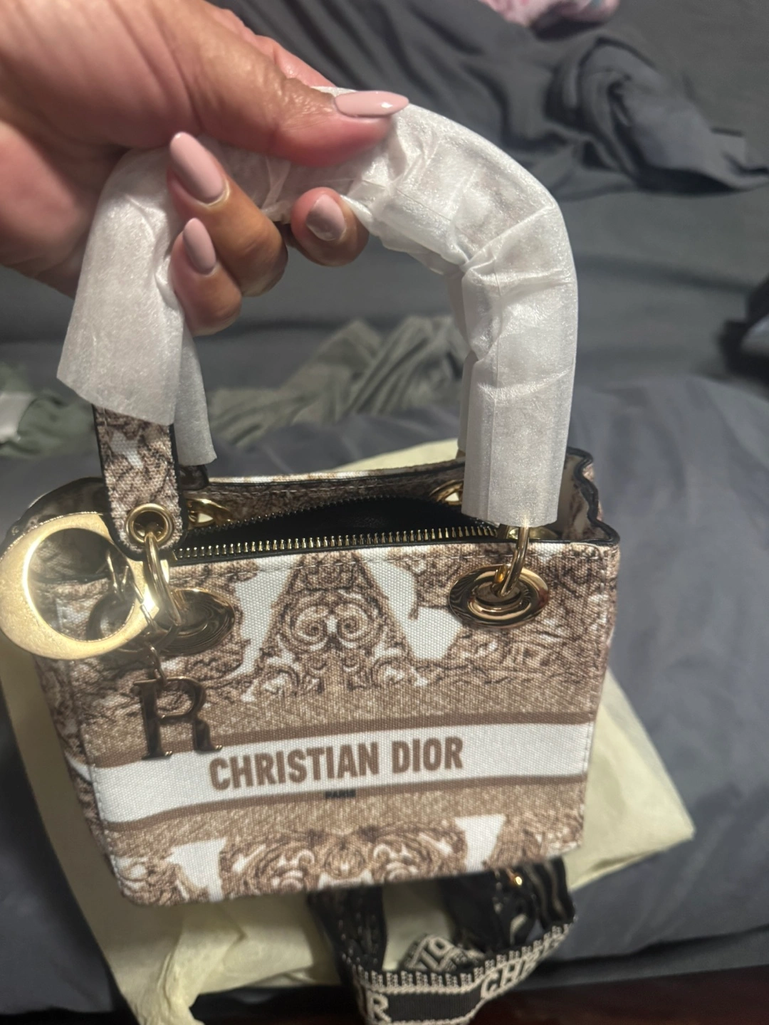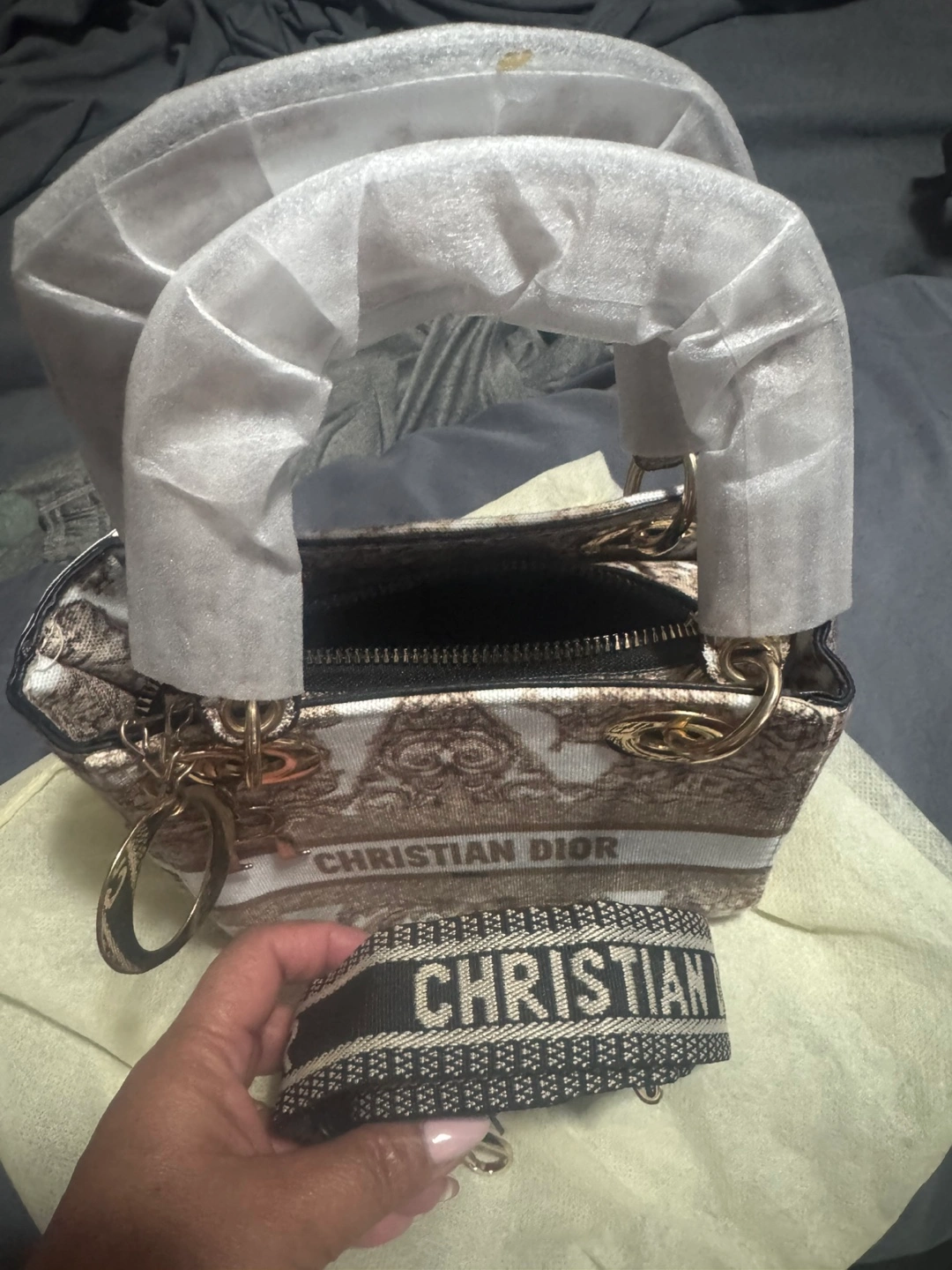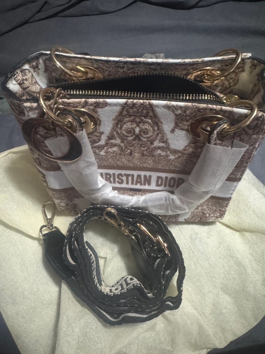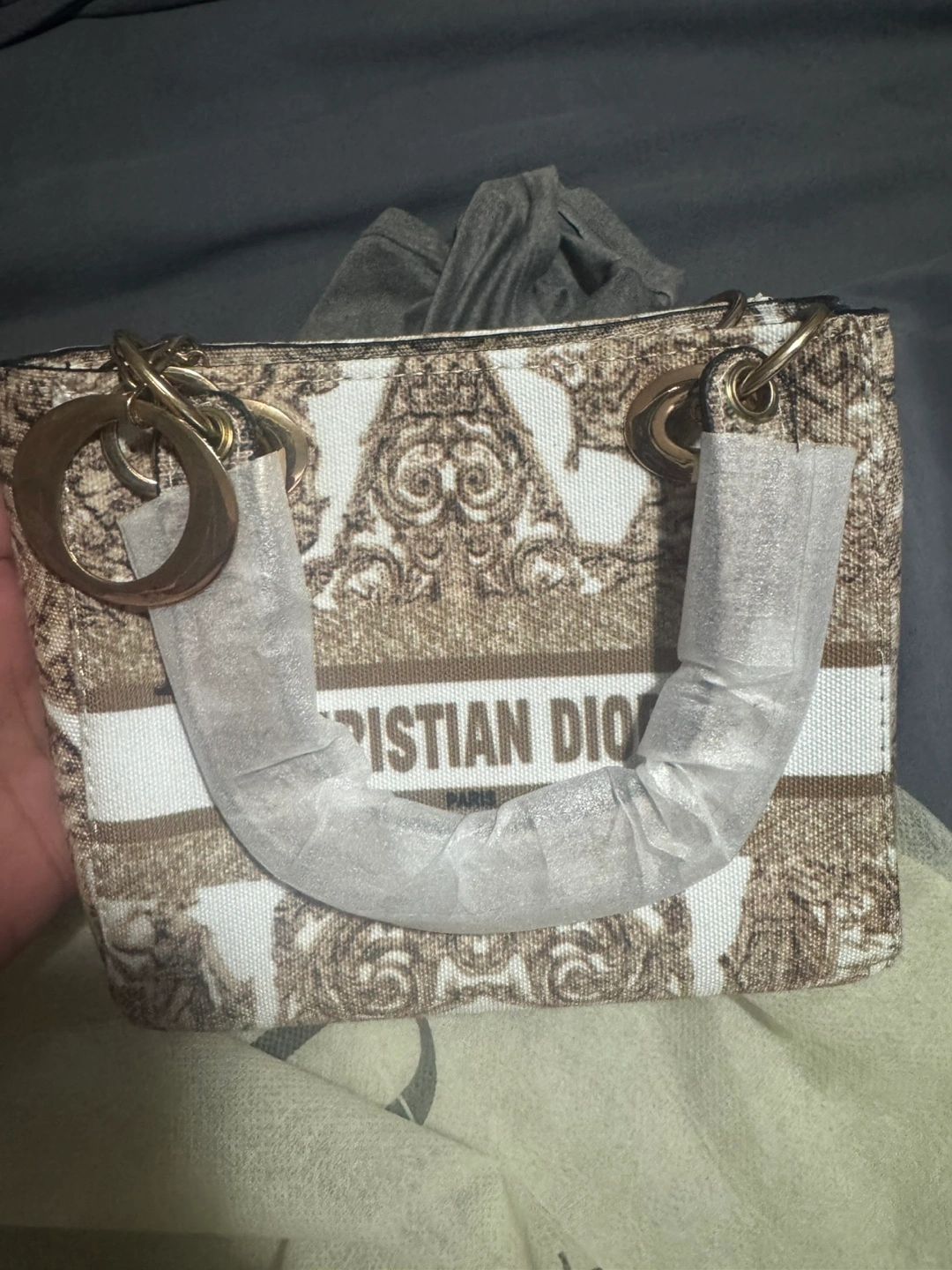 Adorable mini handbag. Features a beige and brown patterned design. Includes a removable shoulder strap. Gold-toned hardware. Perfect for everyday use.