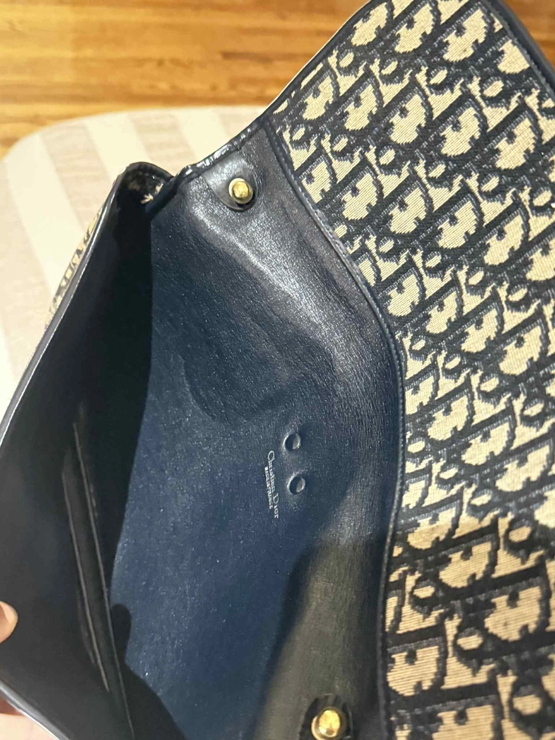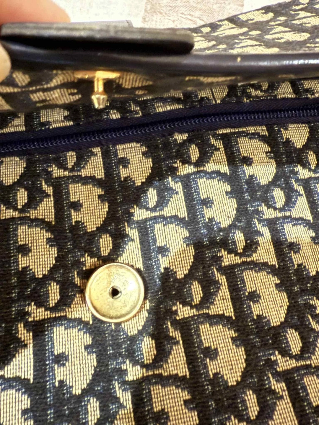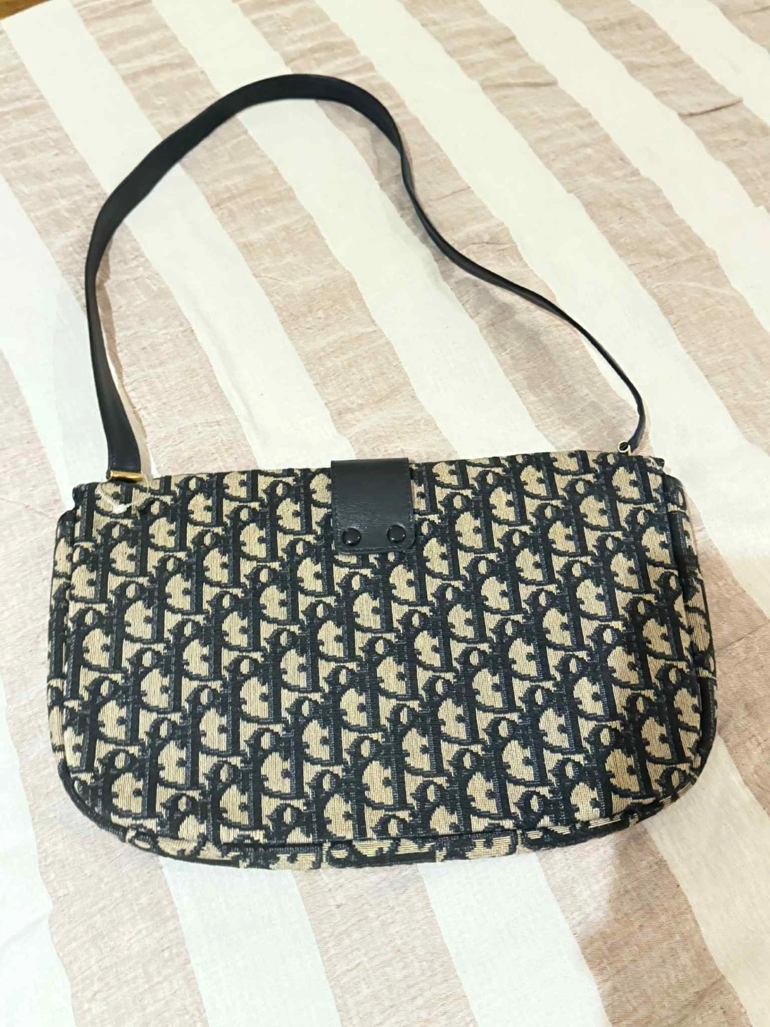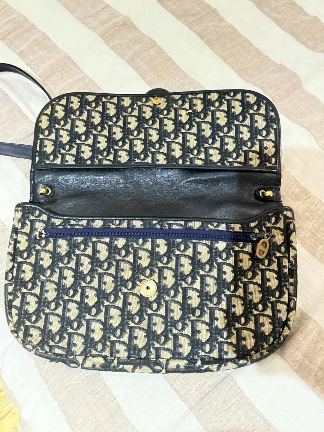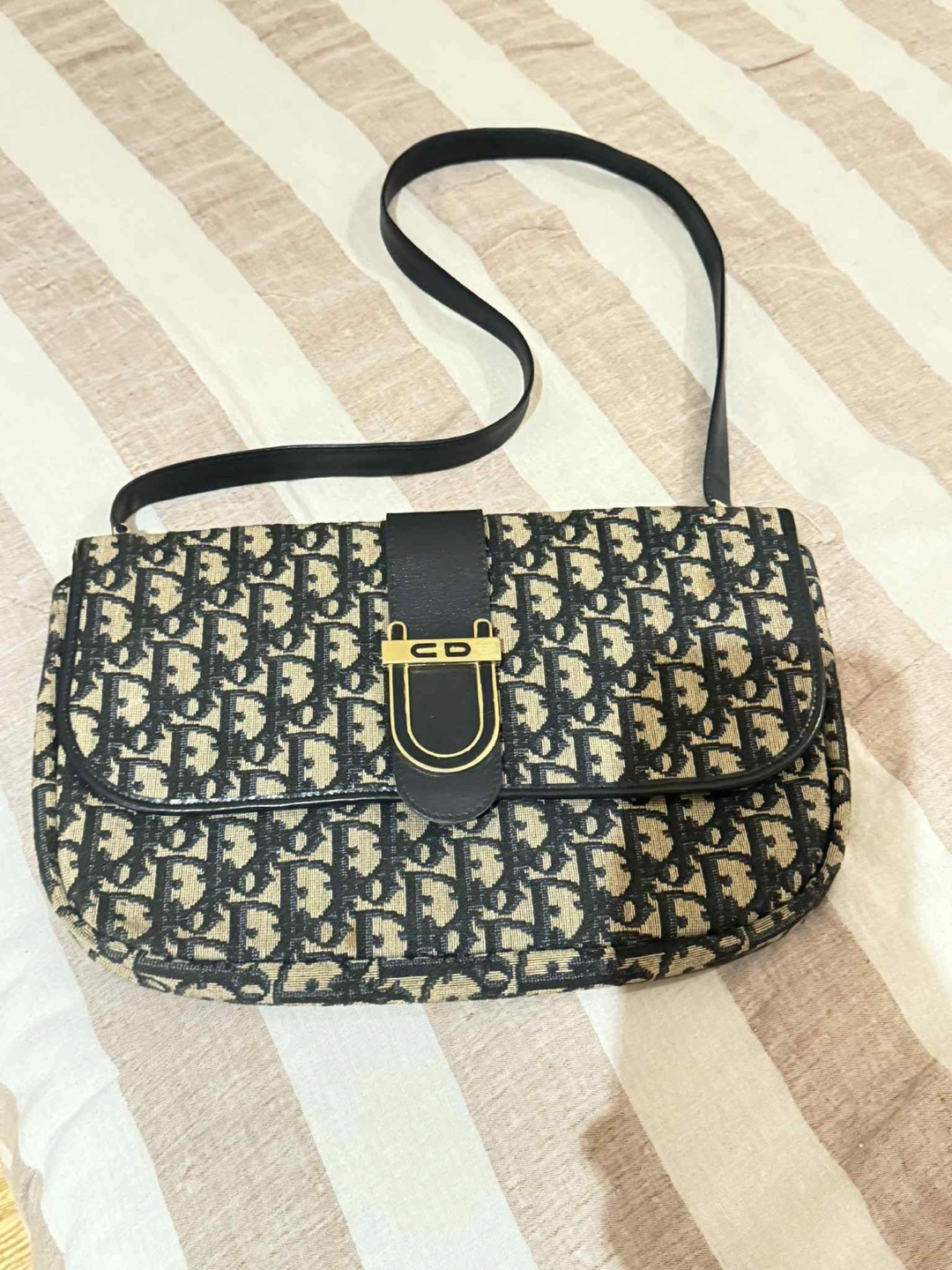 This is a Christian Dior shoulder bag featuring the iconic Dior Oblique canvas pattern in a stylish beige and navy colour combination. It has a leather strap and trim, and a gold-tone metal CD logo clasp. The interior is lined with navy leather and has a zippered pocket. It's in great condition and ready for a new home! Issue- doesn’t lock