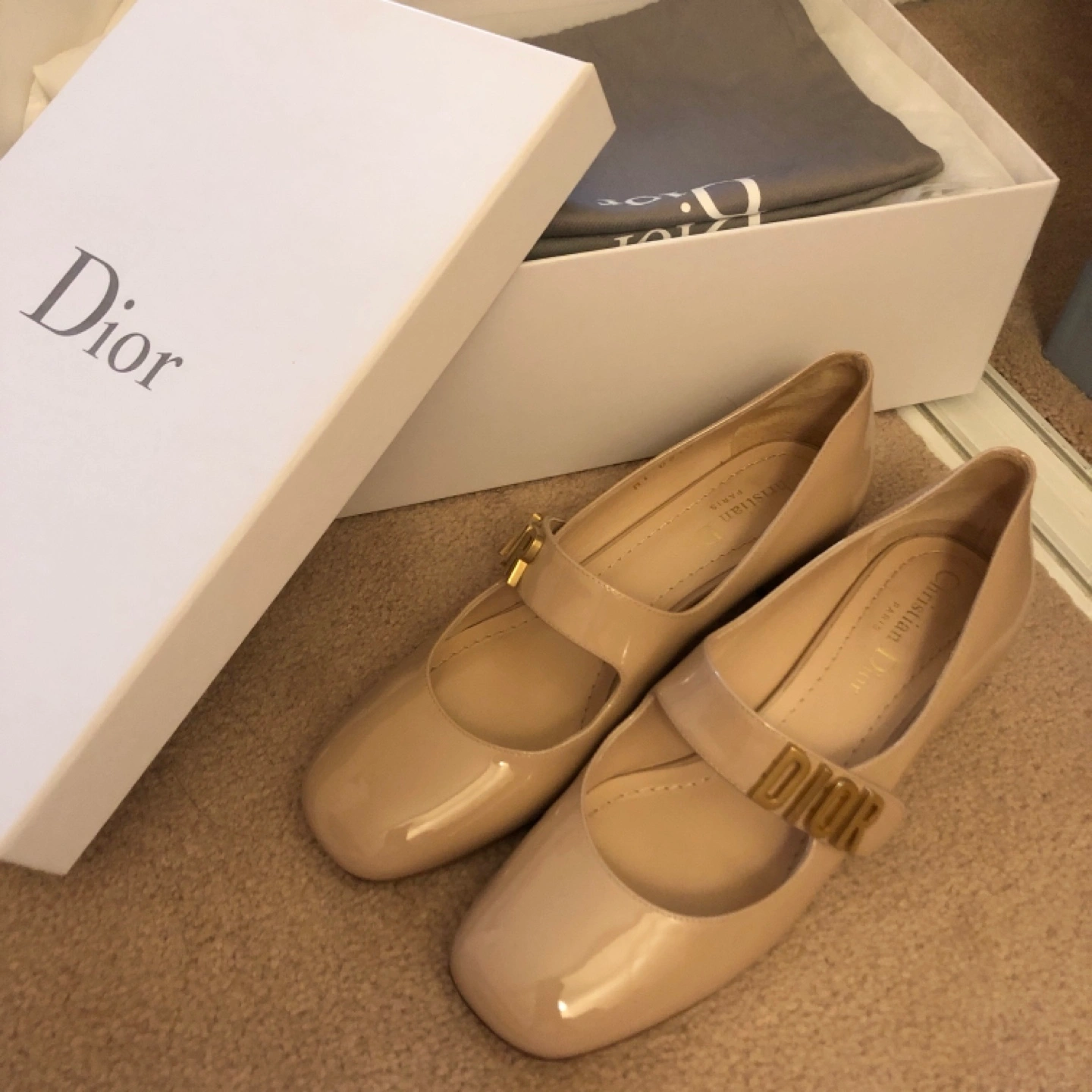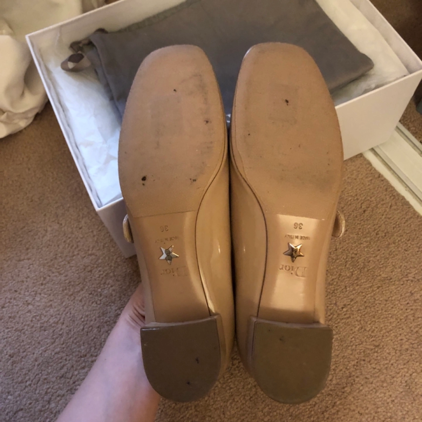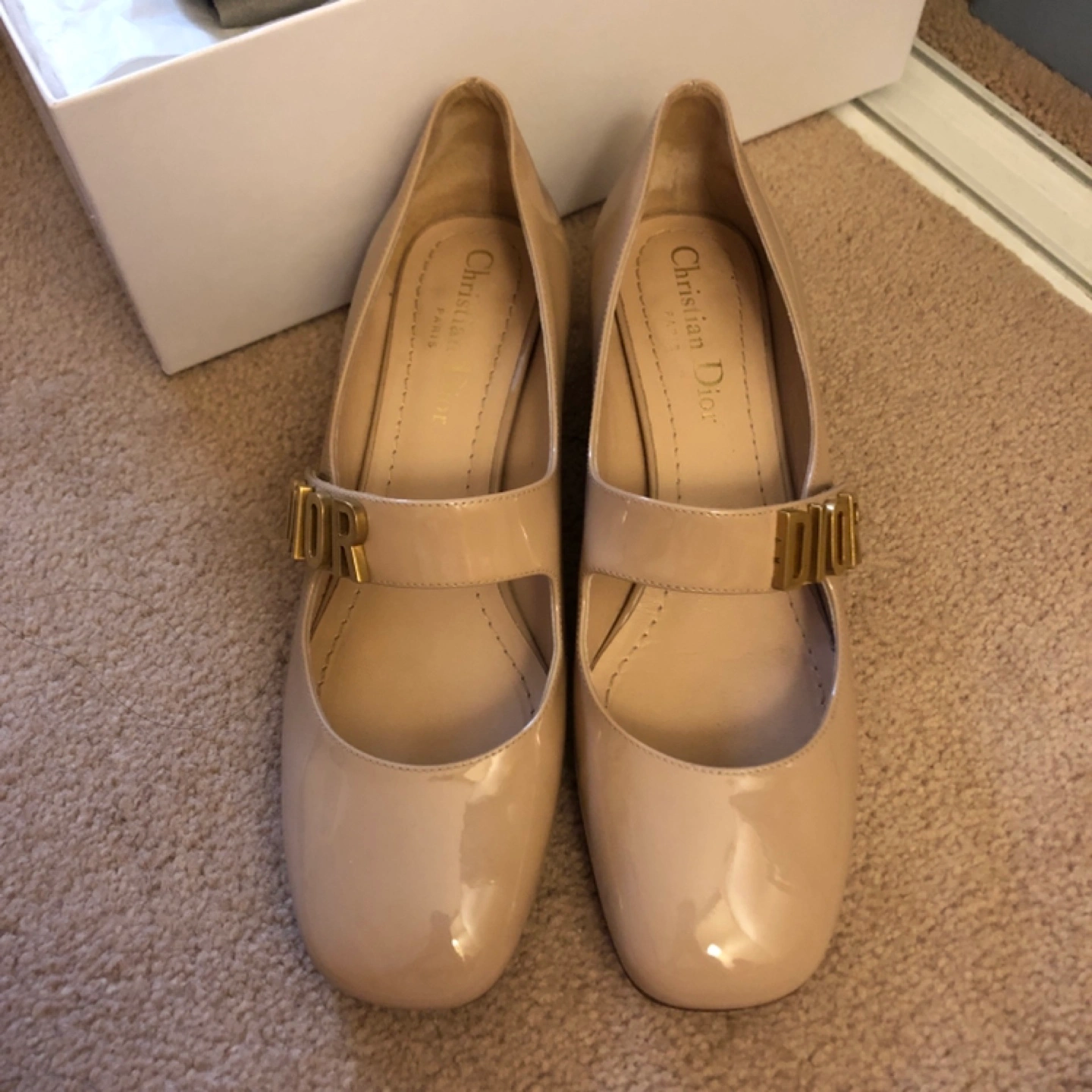 169Beige patent leather ballerina flats. Square toe. Gold Dior logo. Includes box and dust bag. Size 36. Authentic Condition: excellent Retail price is: $1300 after tax