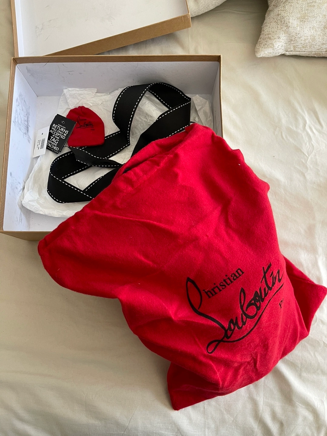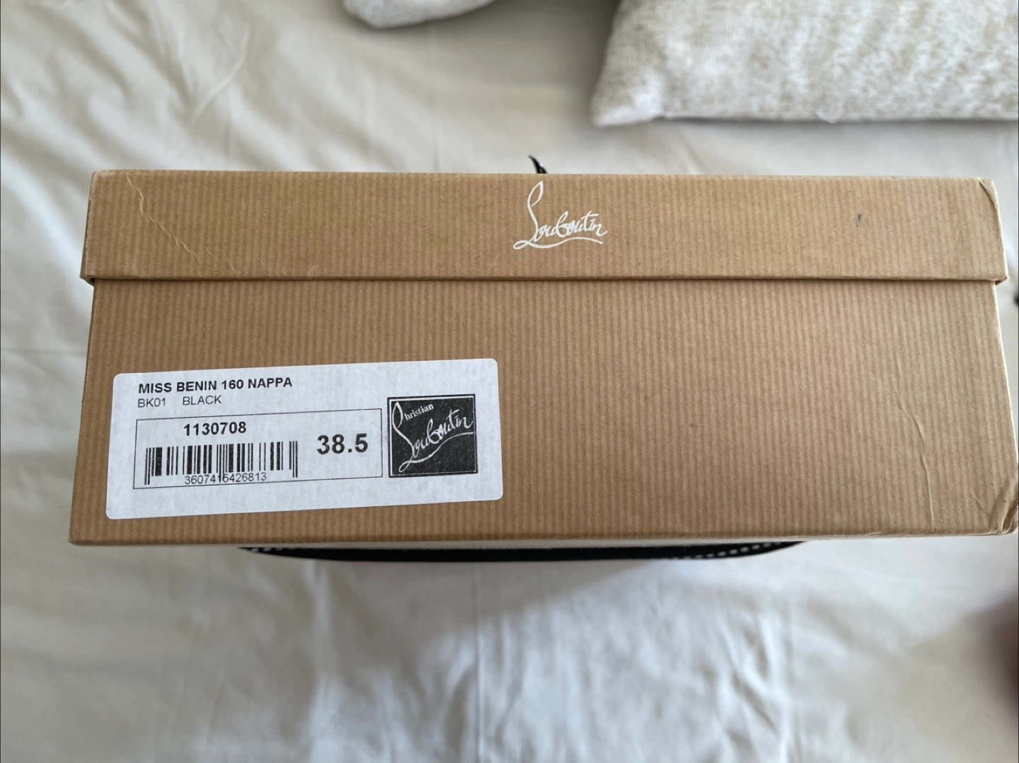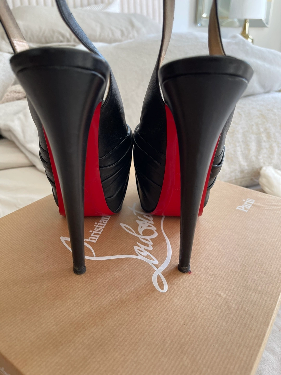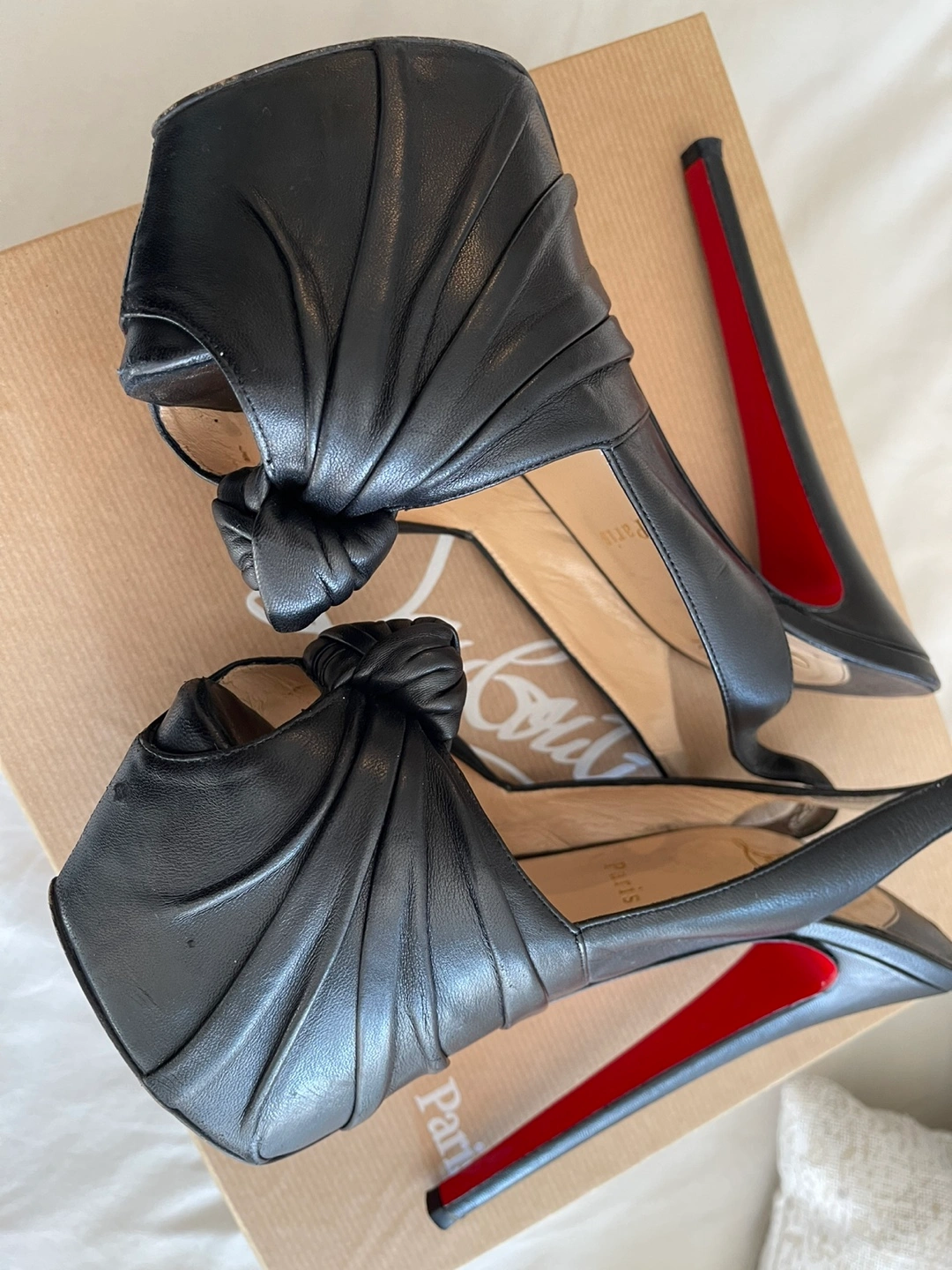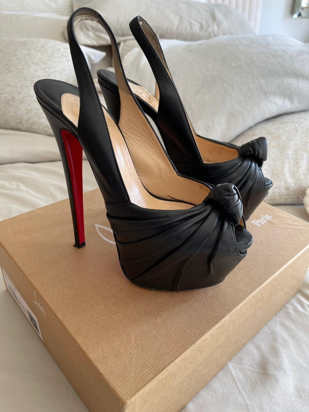 Miss Benin 160 in black. Stunning black leather platform slingback heels. Feature a unique knotted detail at the toe. Red lacquered soles. May need some minor repairs on sides. Includes original box and dust bags
