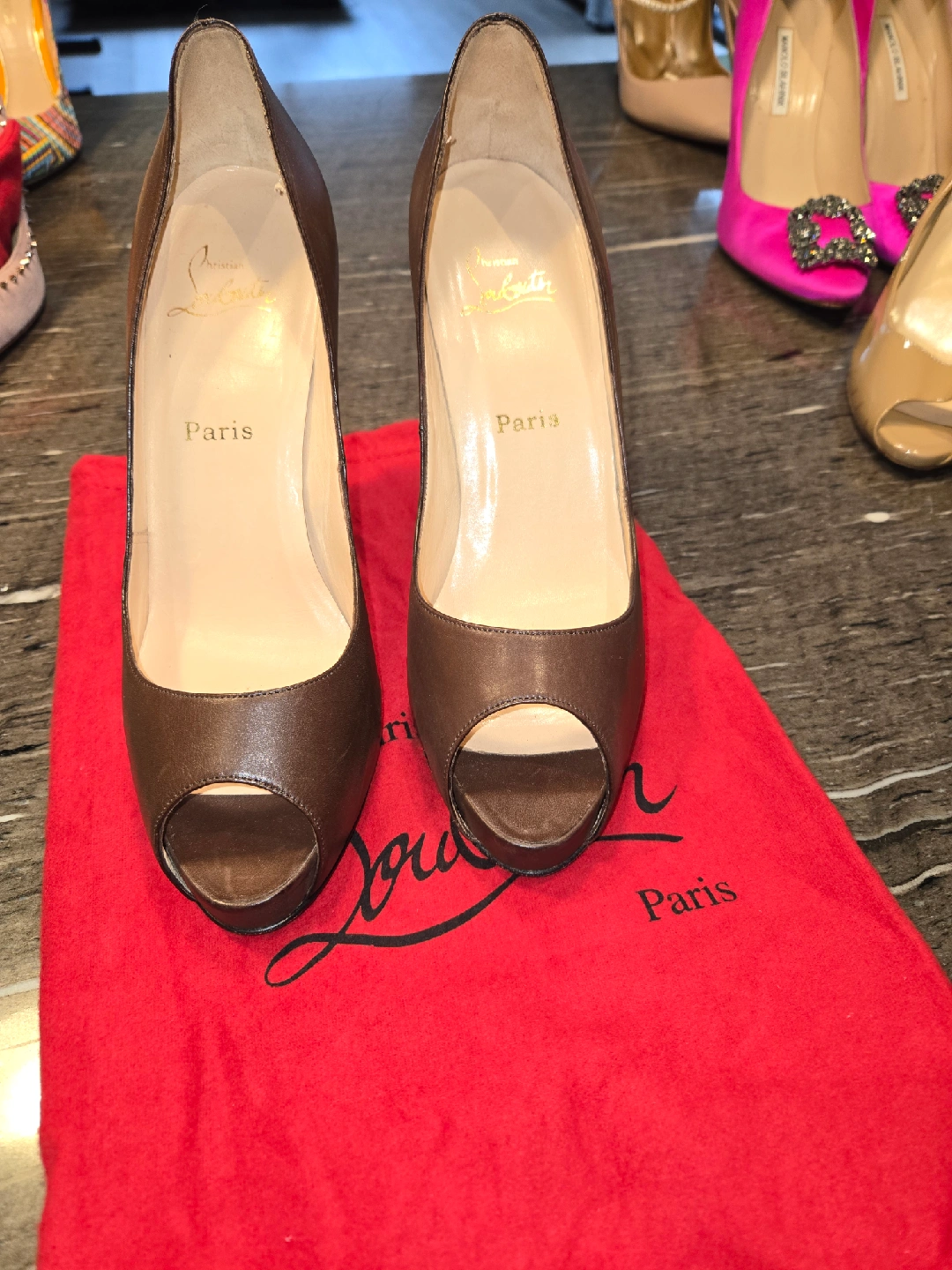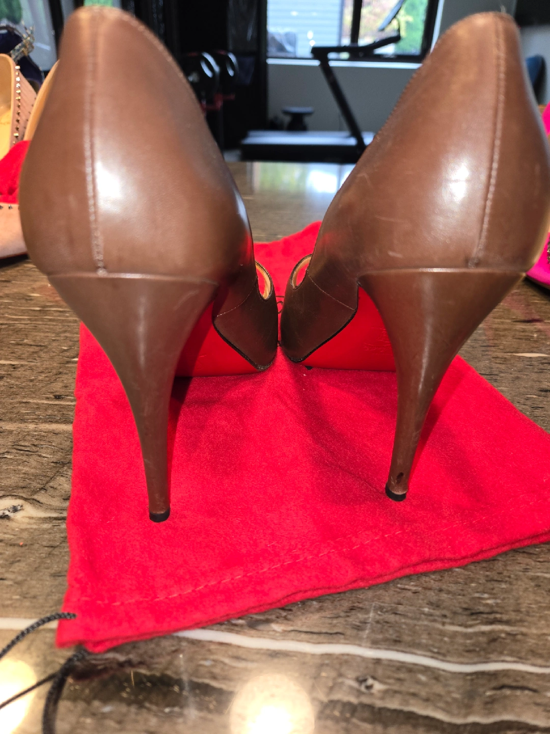 205Selling a pair of Christian Louboutin heels in a lovely brown leather! They are a size 41. The soles show some wear, but the uppers are in great shape. Comes with the original dust bag!