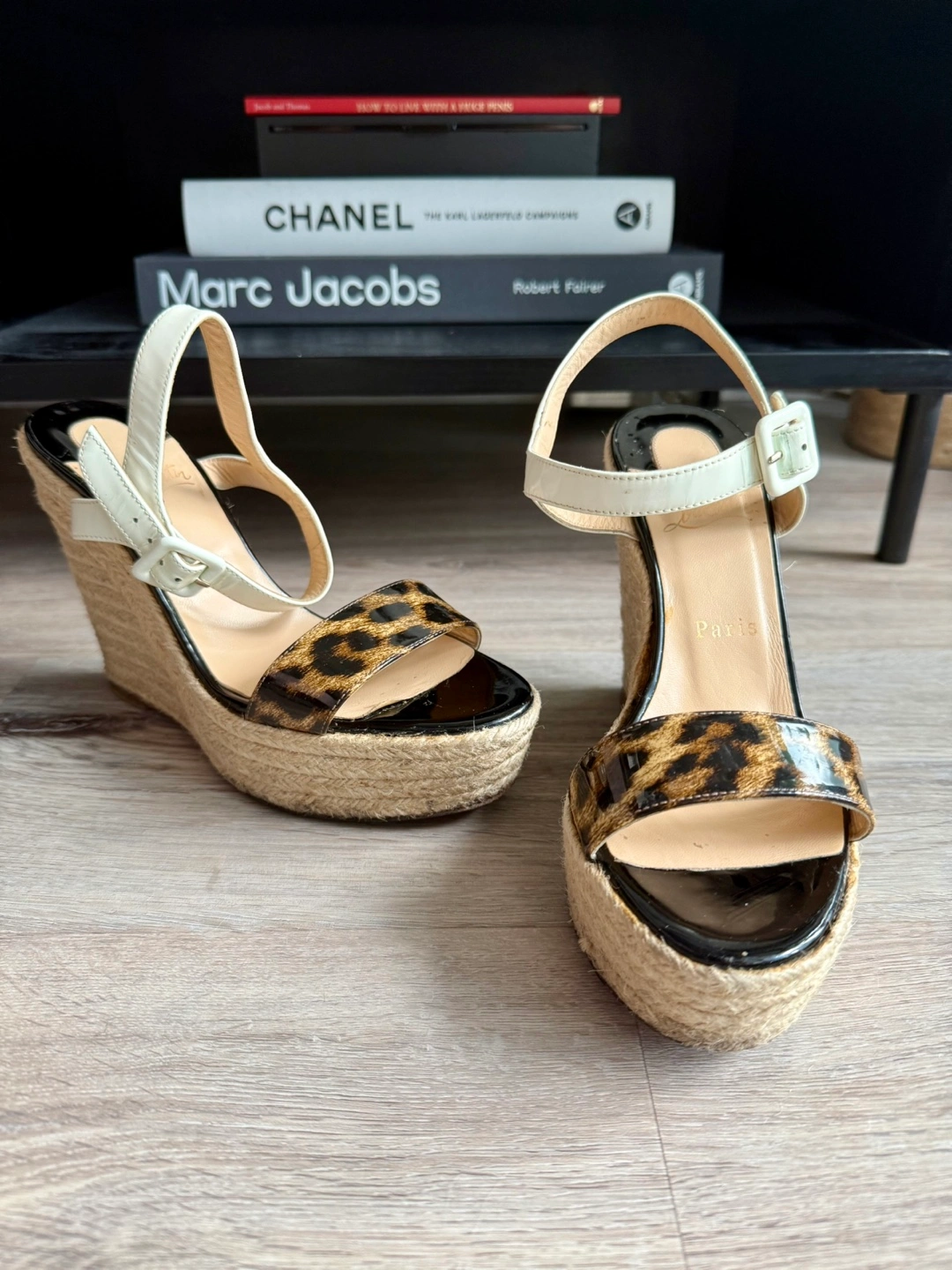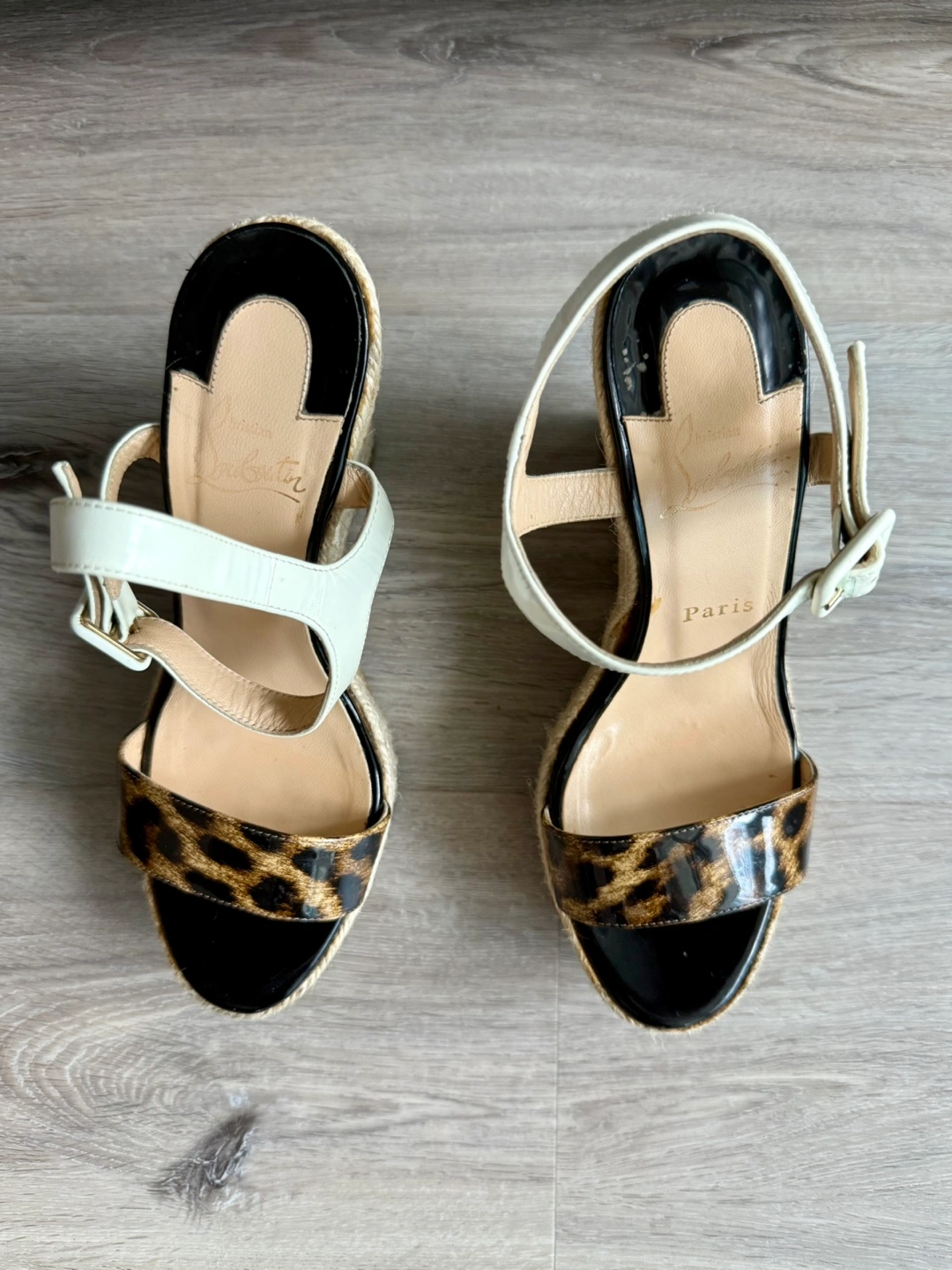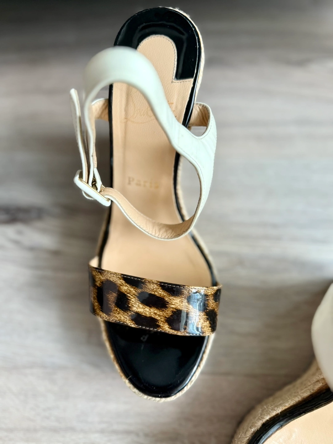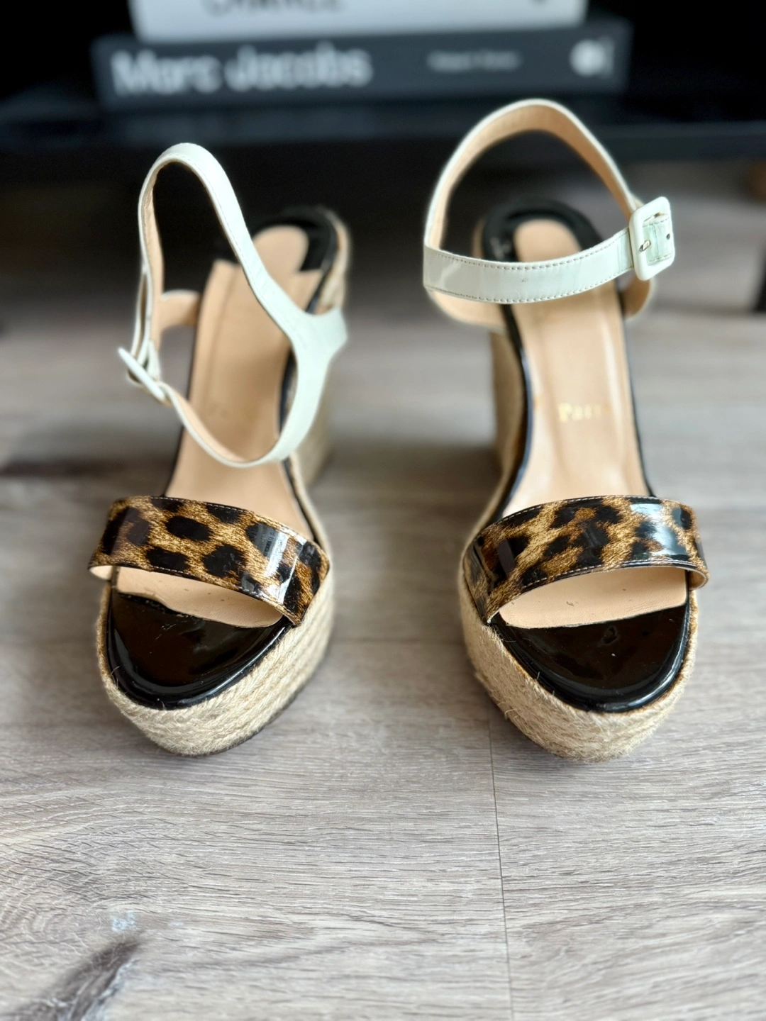 44These Christian Louboutin espadrille wedge sandals are in great condition and ready for a new home! They feature a unique combination of textures and patterns, with a white leather ankle strap, leopard print leather toe strap, and a classic espadrille wedge heel.