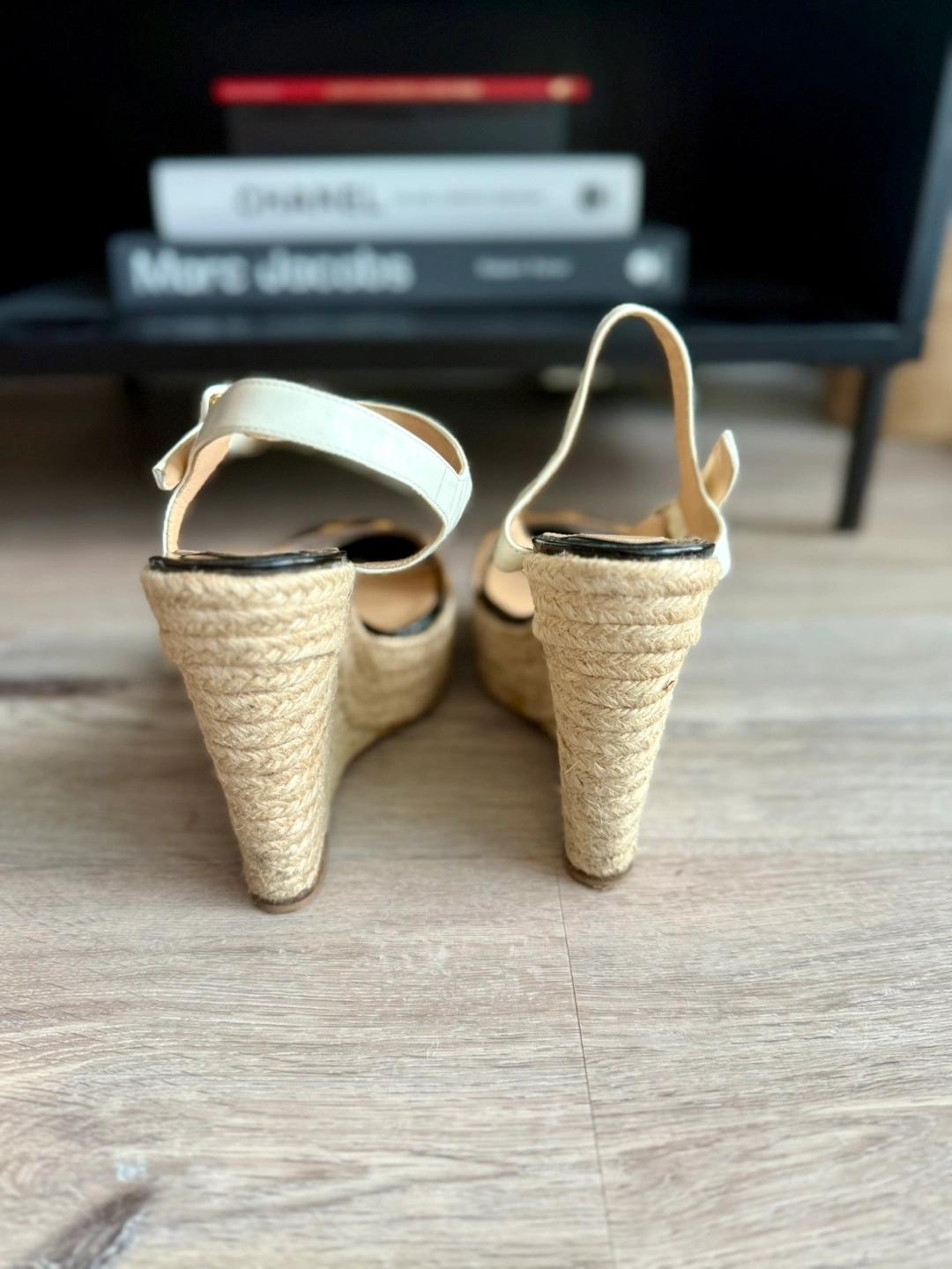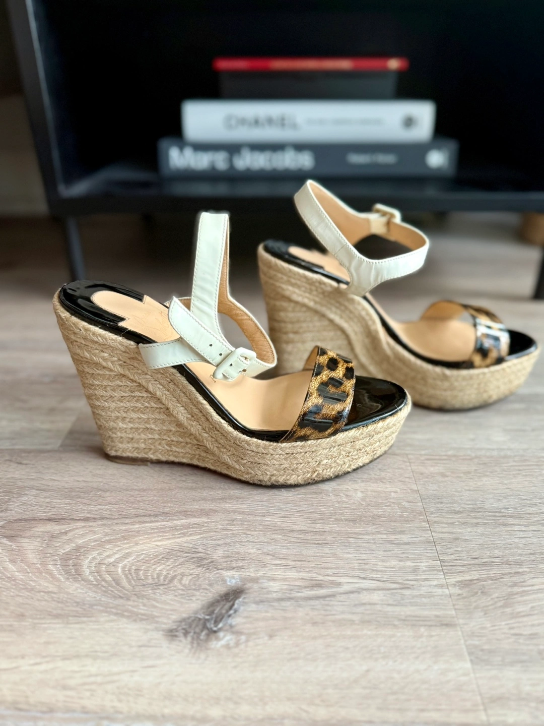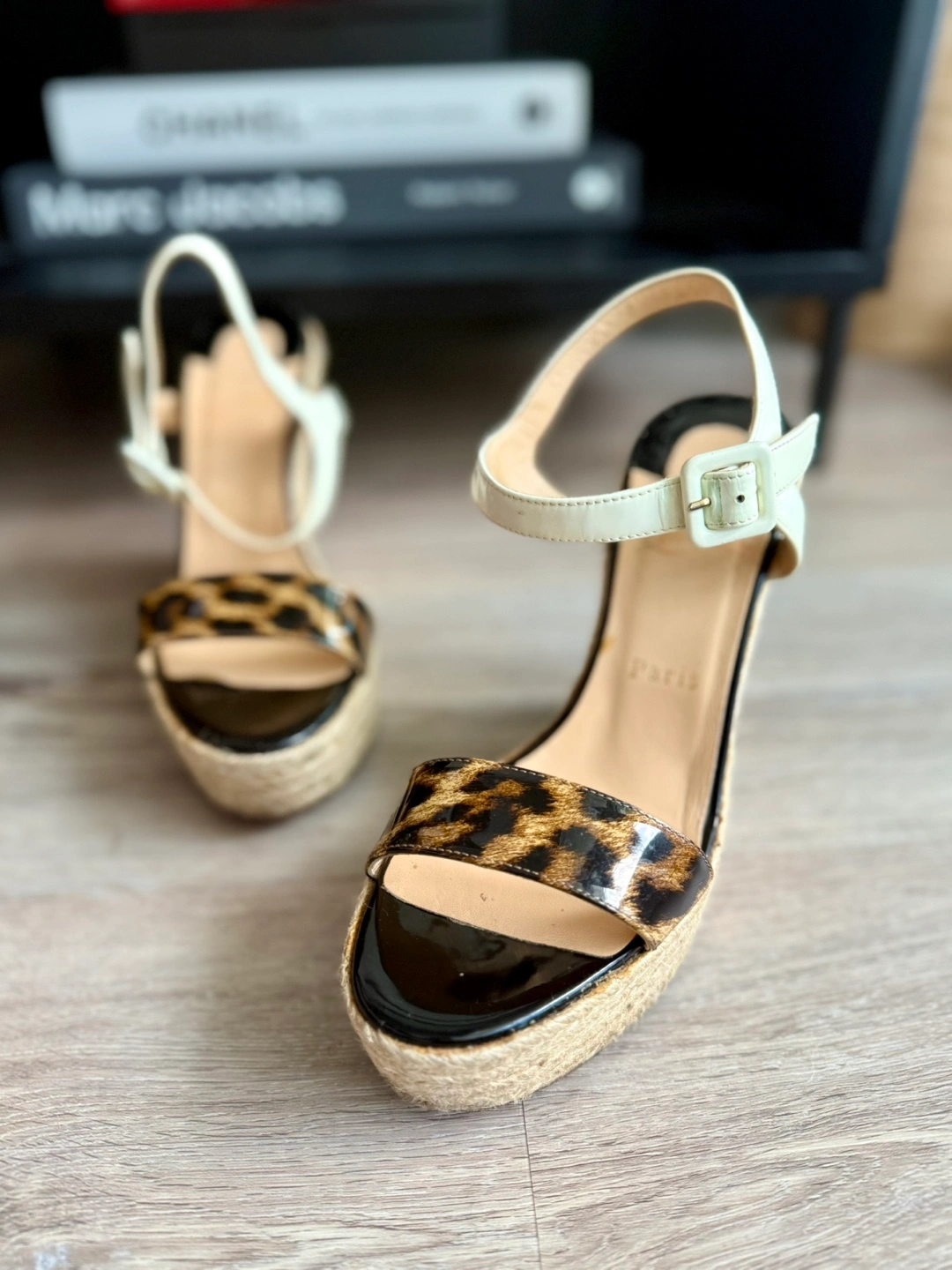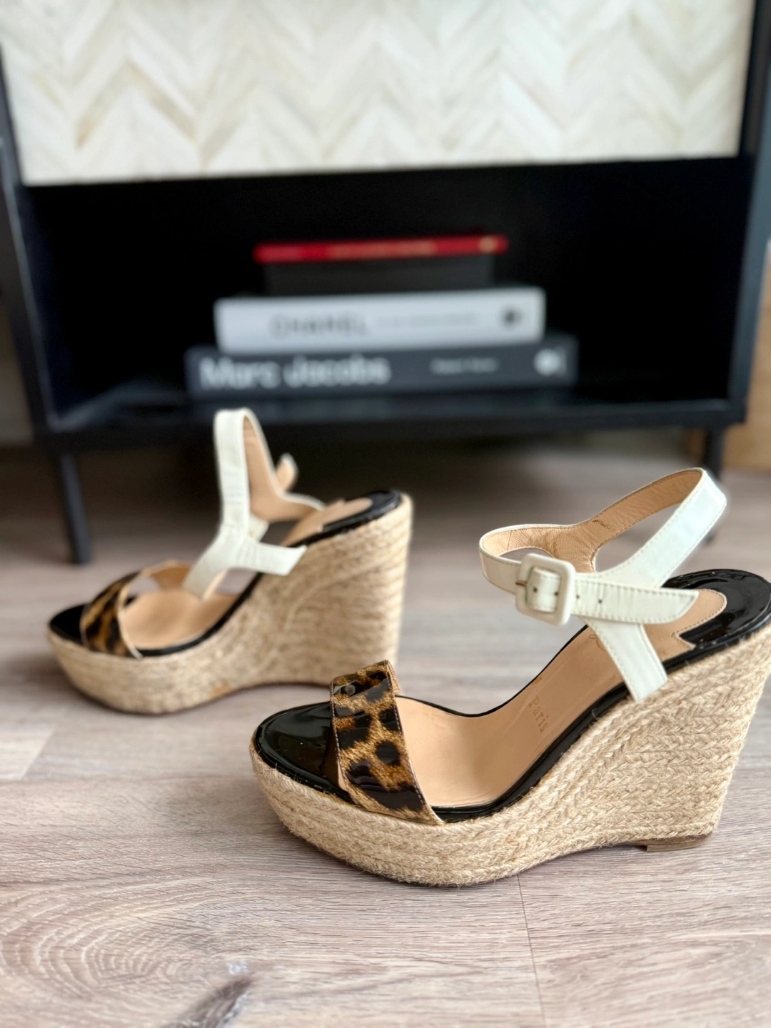 44These Christian Louboutin espadrille wedge sandals are in great condition and ready for a new home! They feature a unique combination of textures and patterns, with a white leather ankle strap, leopard print leather toe strap, and a classic espadrille wedge heel.