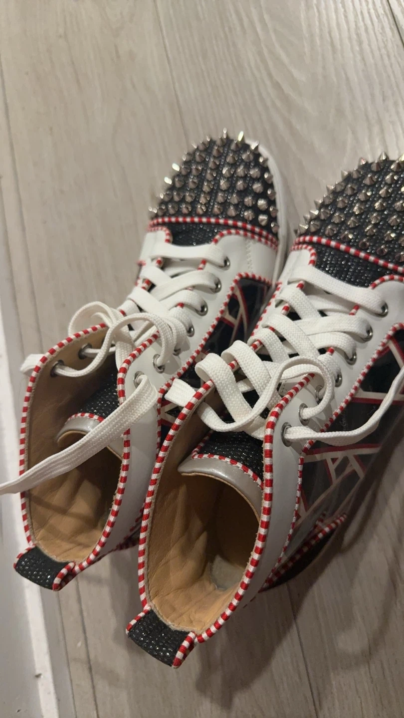 18These Christian Louboutin high-top sneakers are sure to turn heads! They feature a unique design with studs and a mix of black, white, and red accents. A stylish addition to any wardrobe! 38.5, fits women’s 7.5-8 Gently worn
