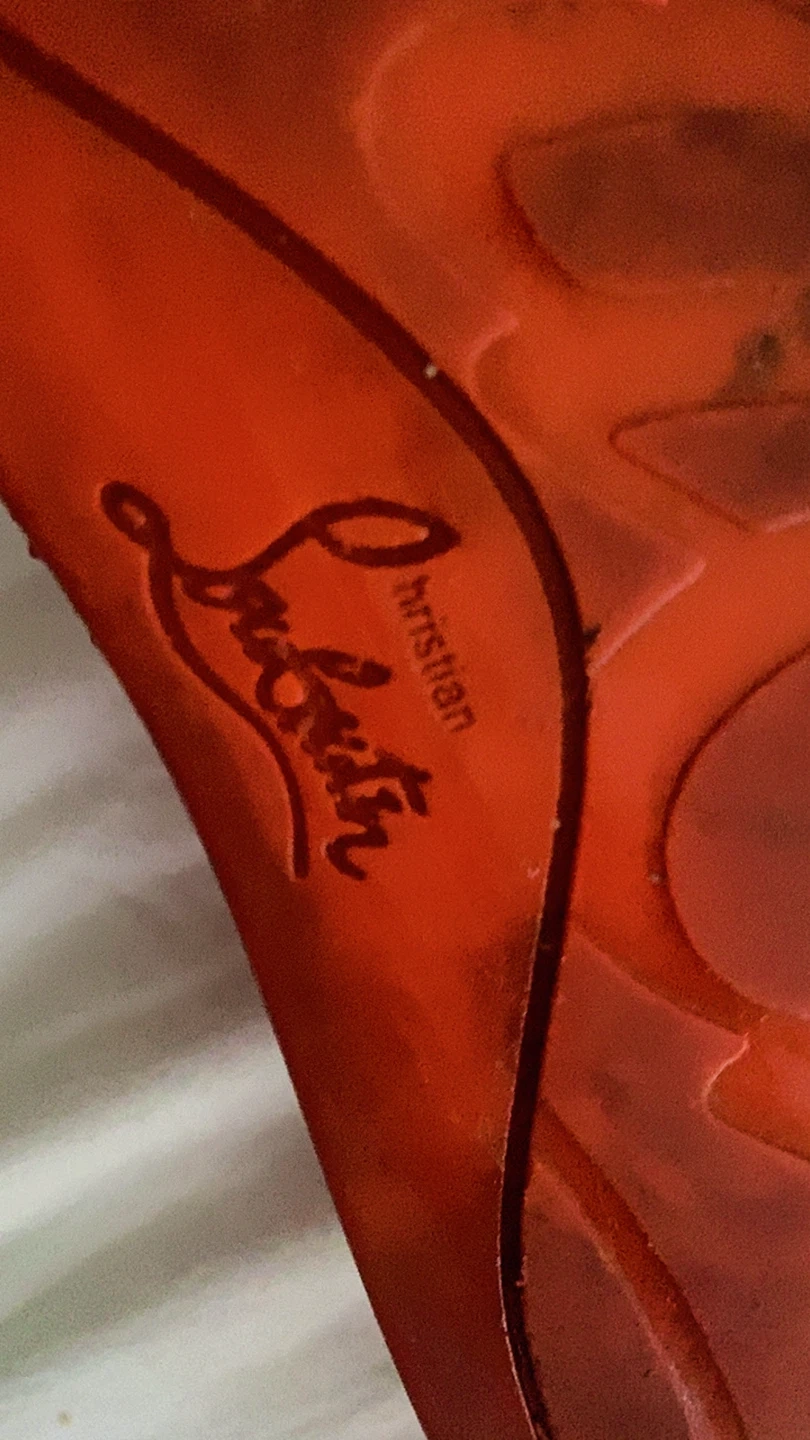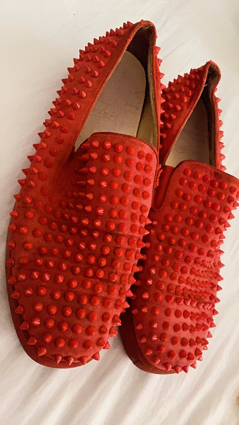 10Check out these eye-catching Christian Louboutin slip-on shoes! They feature a unique red spiked design that's sure to turn heads. Perfect for adding a bold touch to your wardrobe